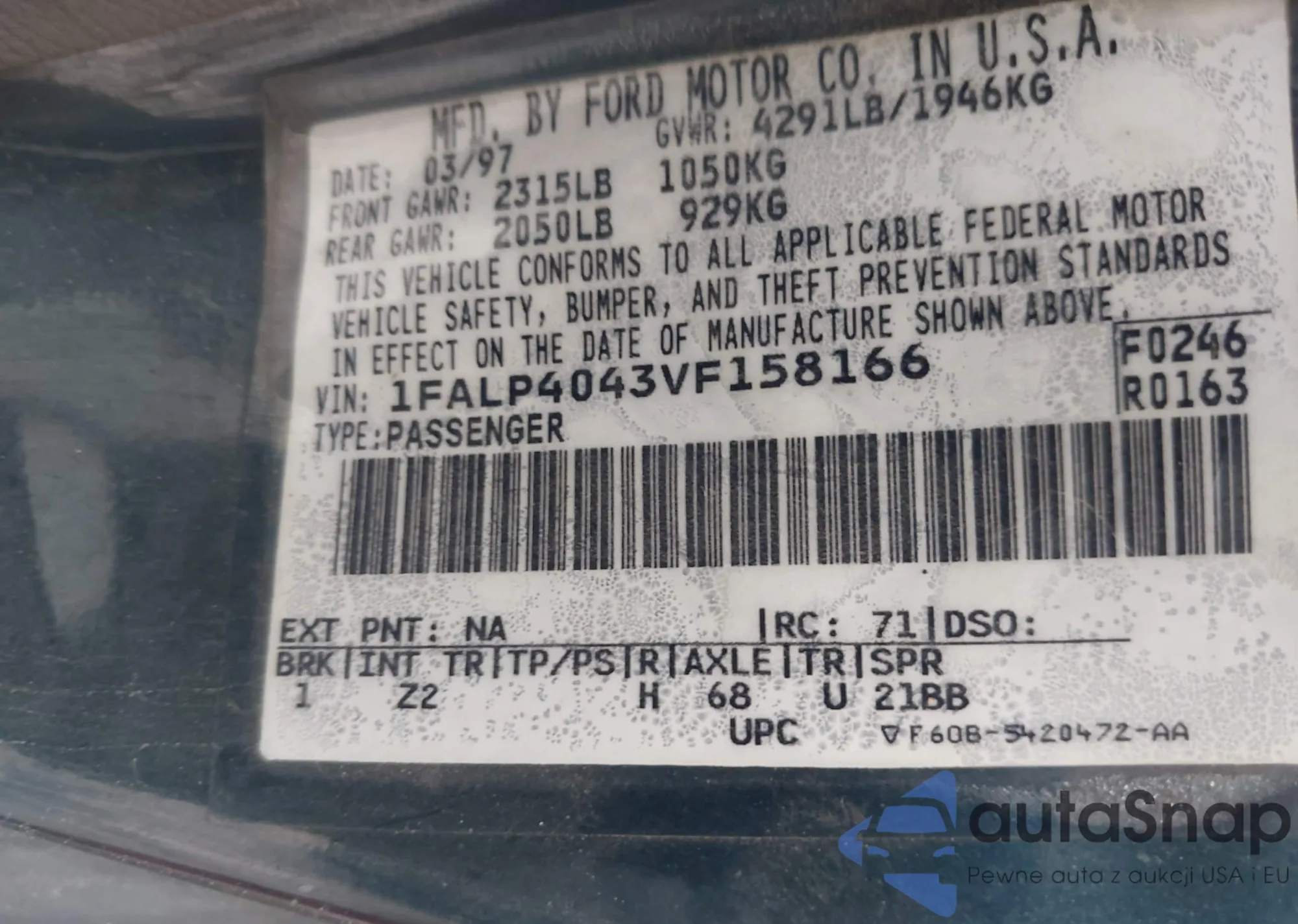 LOT: 39369761 VIN: 1FALP4043VF158166