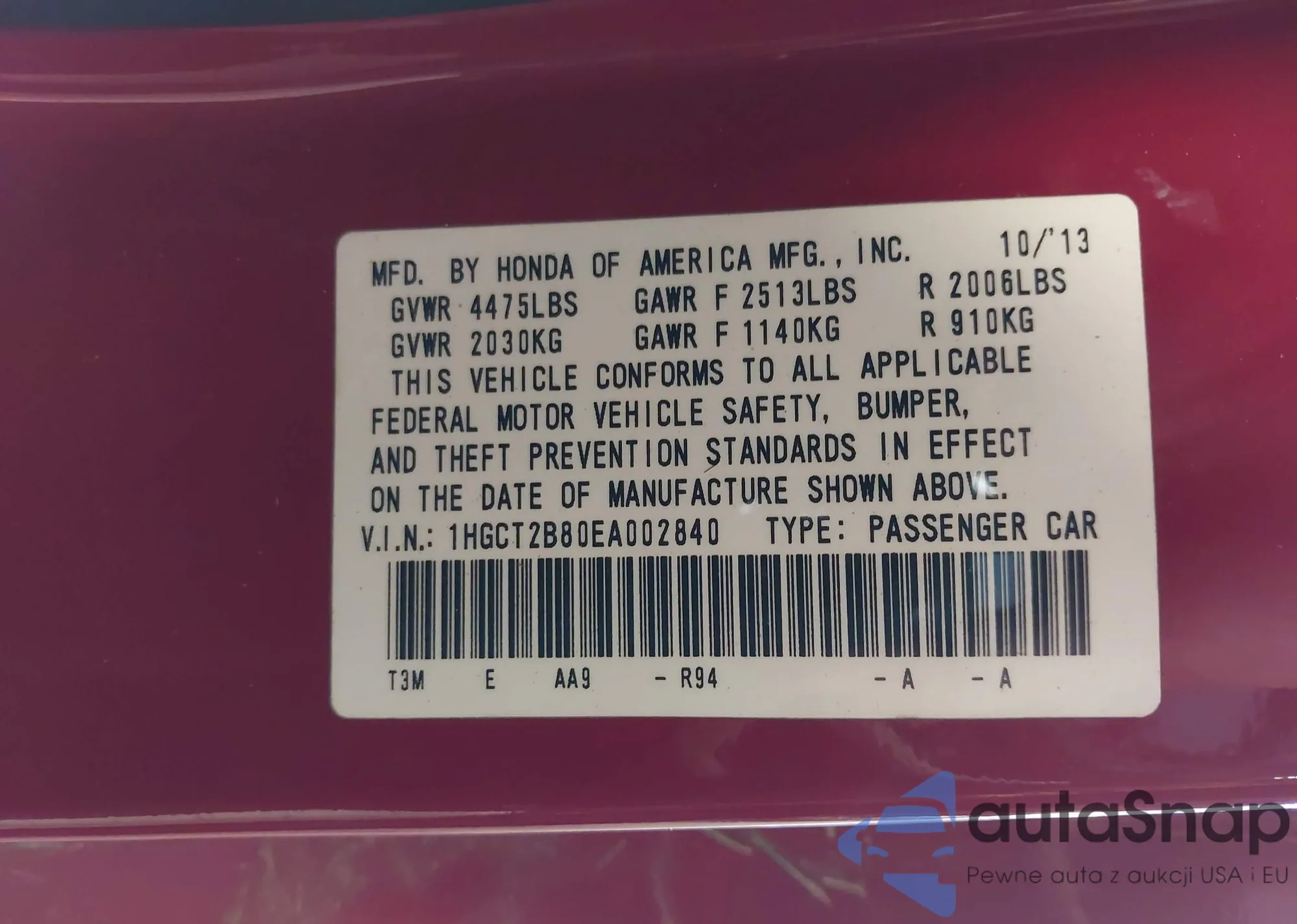 LOT: 39821112 VIN: 1HGCT2B80EA002840