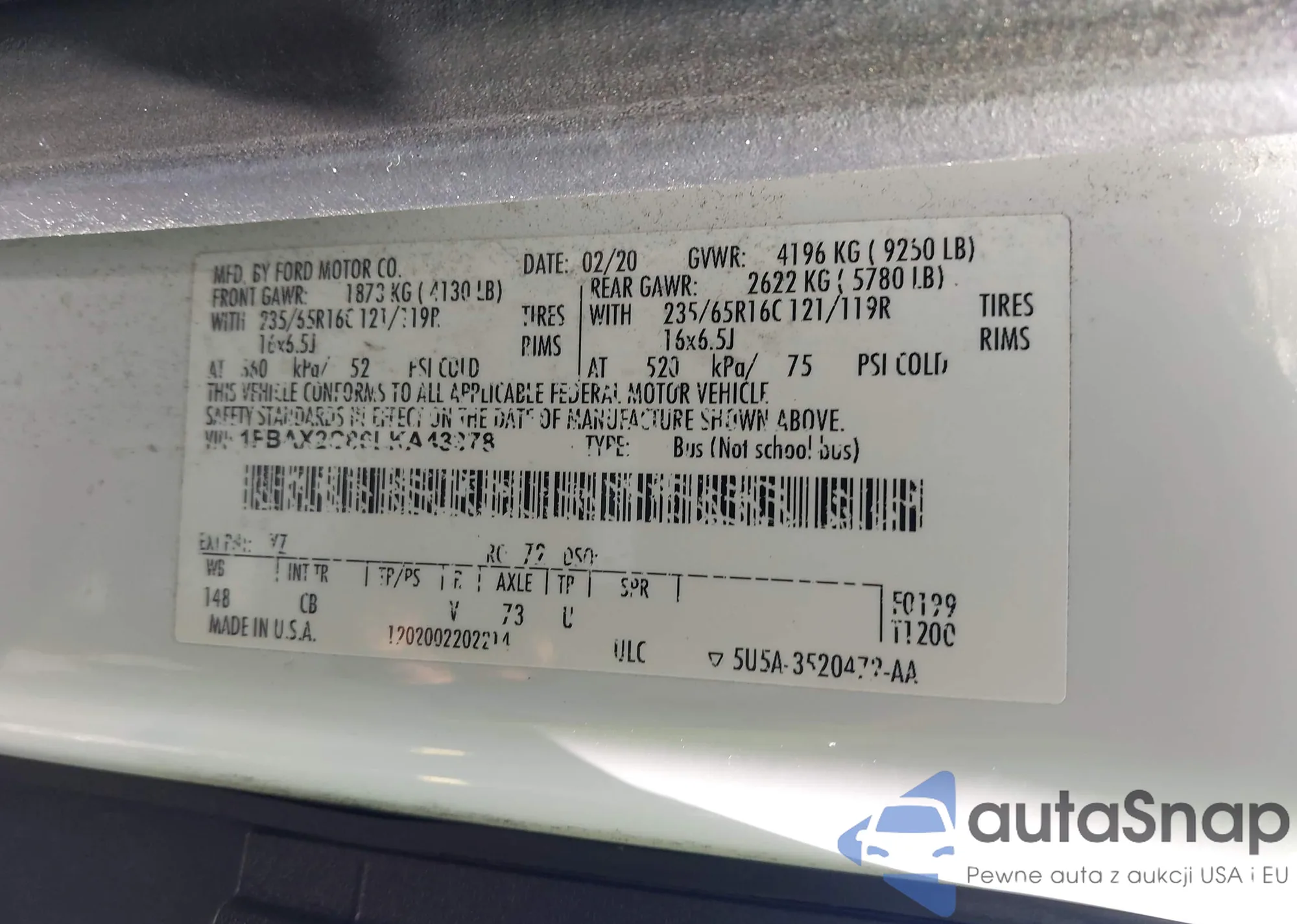 LOT: 43313936 VIN: 1FBAX2C86LKA43378