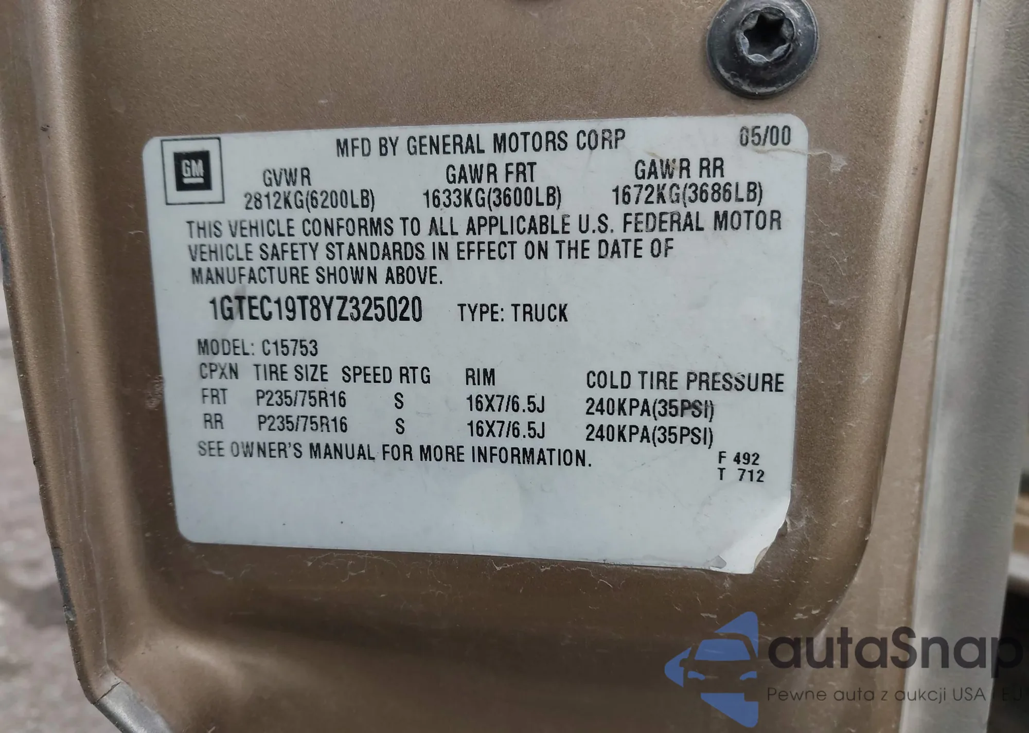 • VIN 1GTEC19T8YZ325020