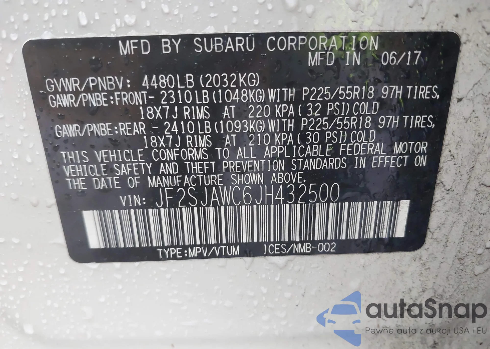 • VIN JF2SJAWC6JH432500