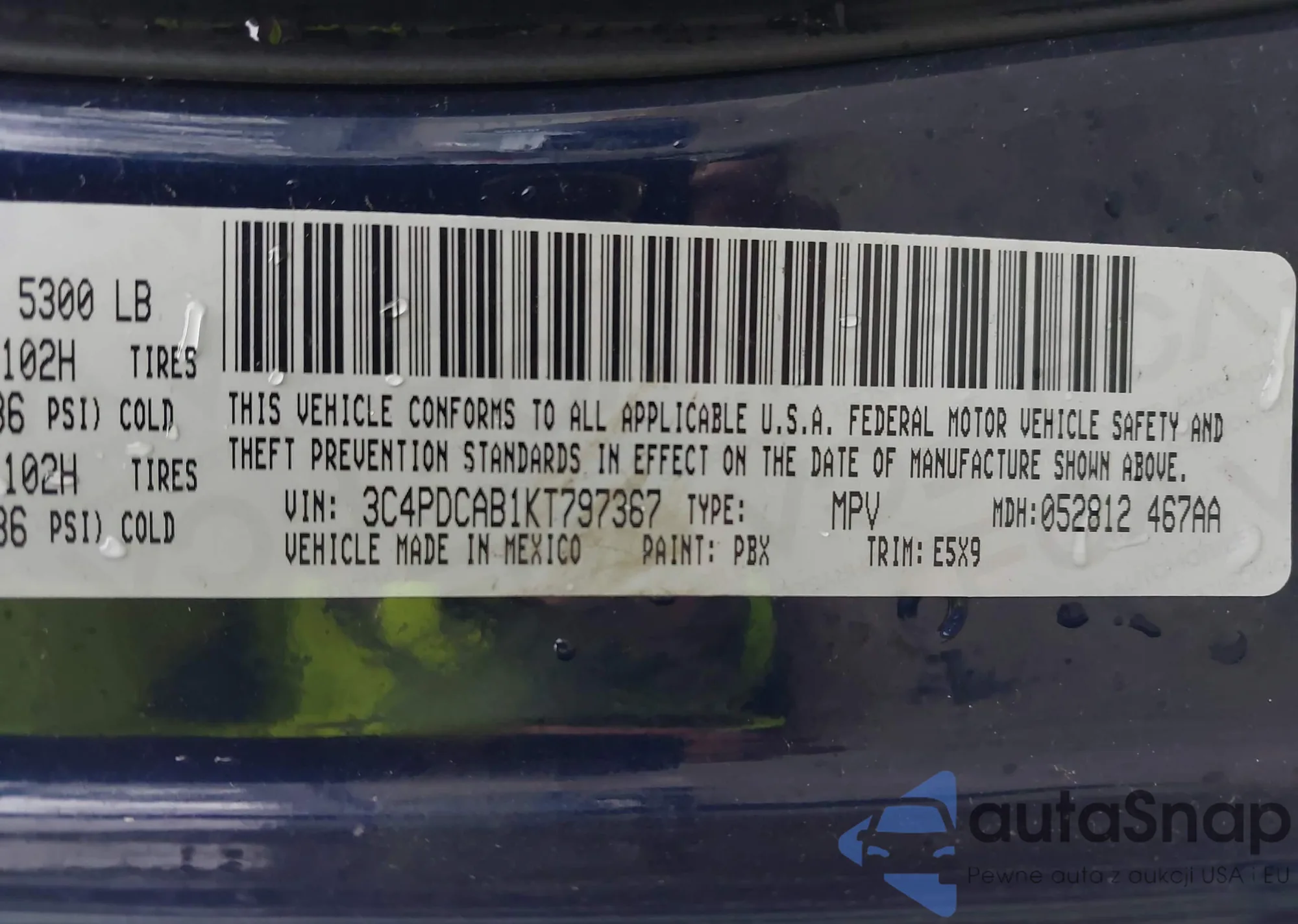 LOT: 43760527 VIN: 3C4PDCAB1KT797367