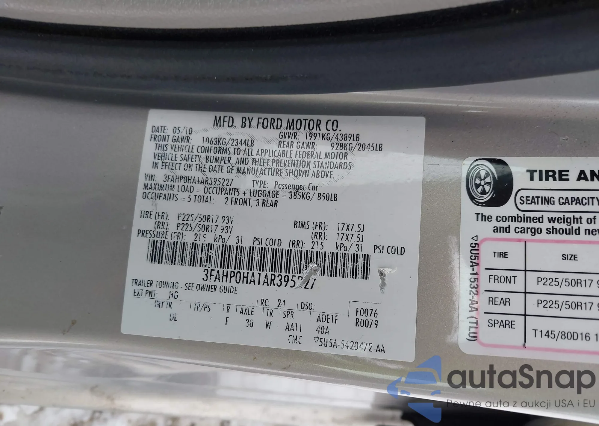 • VIN 3FAHP0HA1AR395227
