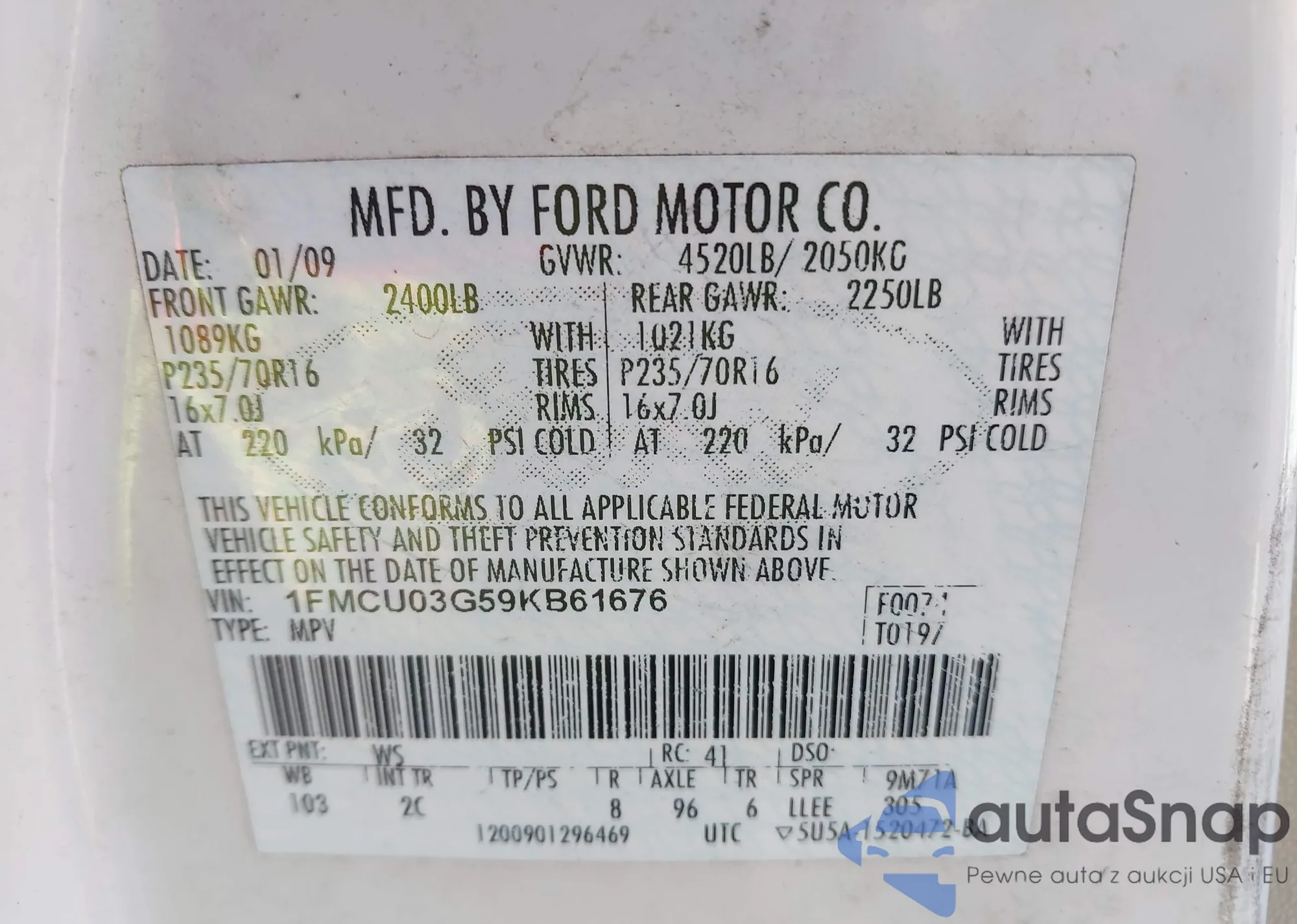LOT: 43421435 VIN: 1FMCU03G59KB61676
