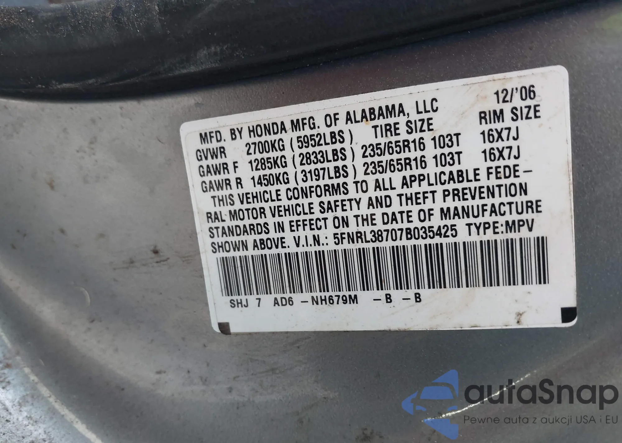 LOT: 43702351 VIN: 5FNRL38707B035425