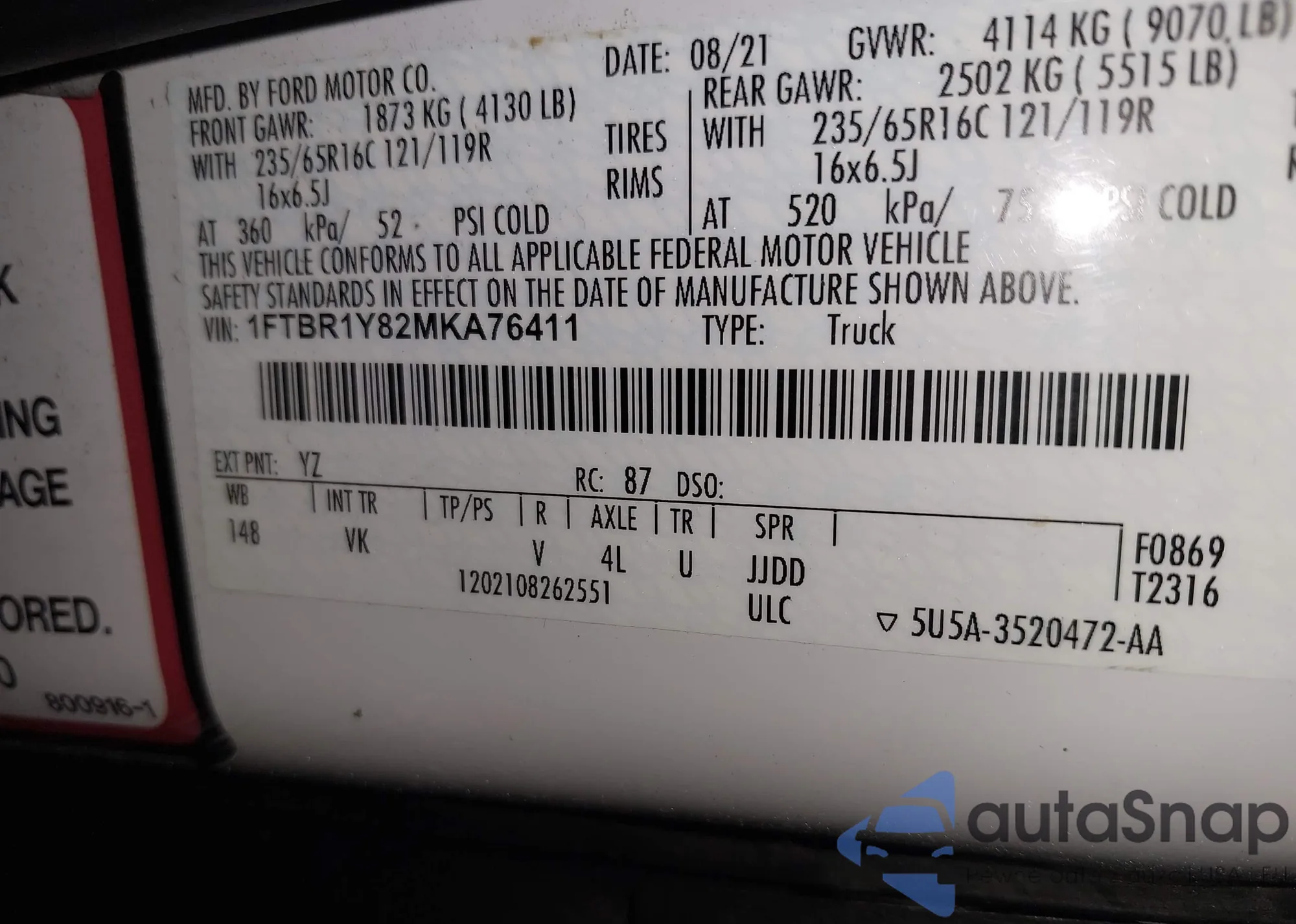 • VIN 1FTBR1Y82MKA76411