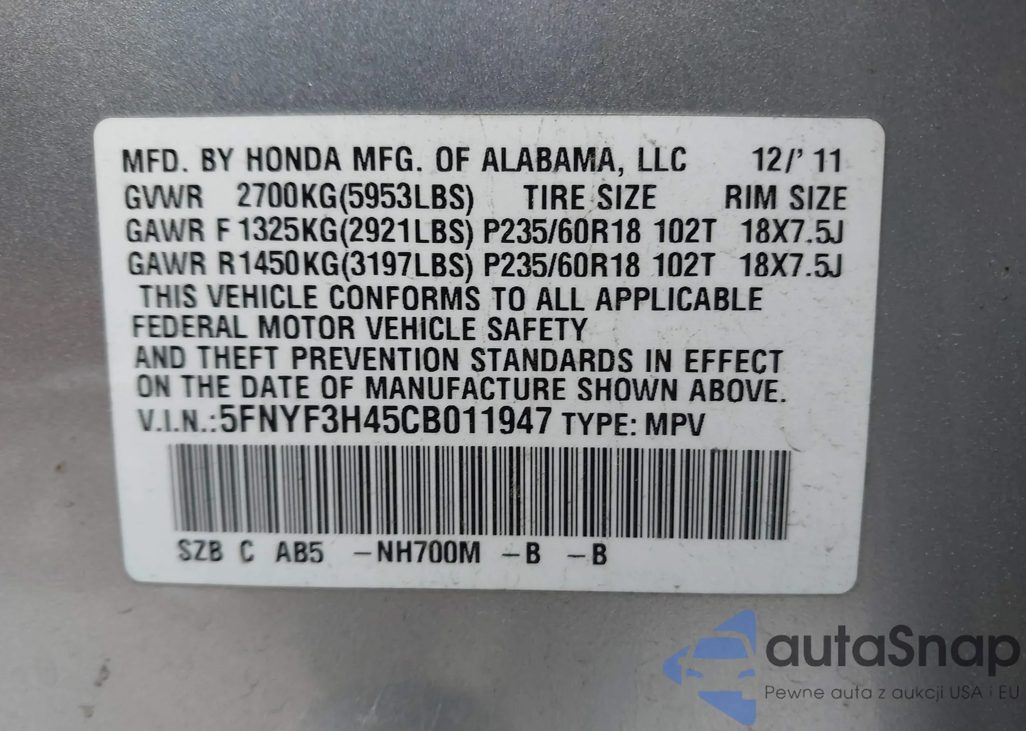 2012 Honda Pilot Ex z USA, uszkodzony, nr VIN 5FNYF3H45CB011947