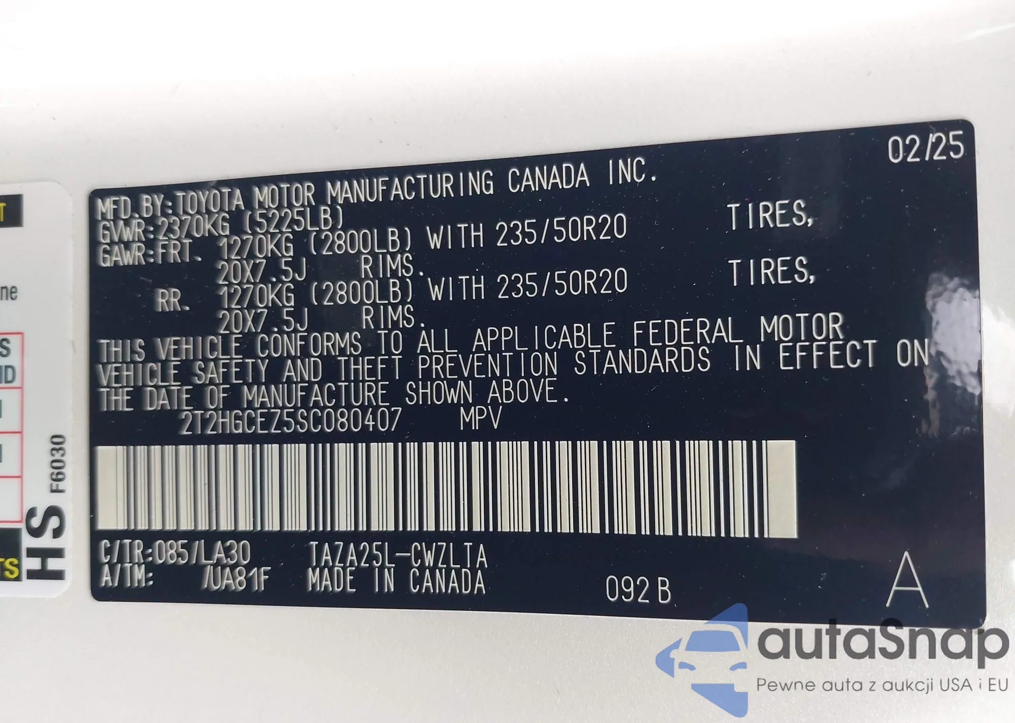 LOT: 43490175 VIN: 2T2HGCEZ5SC080407