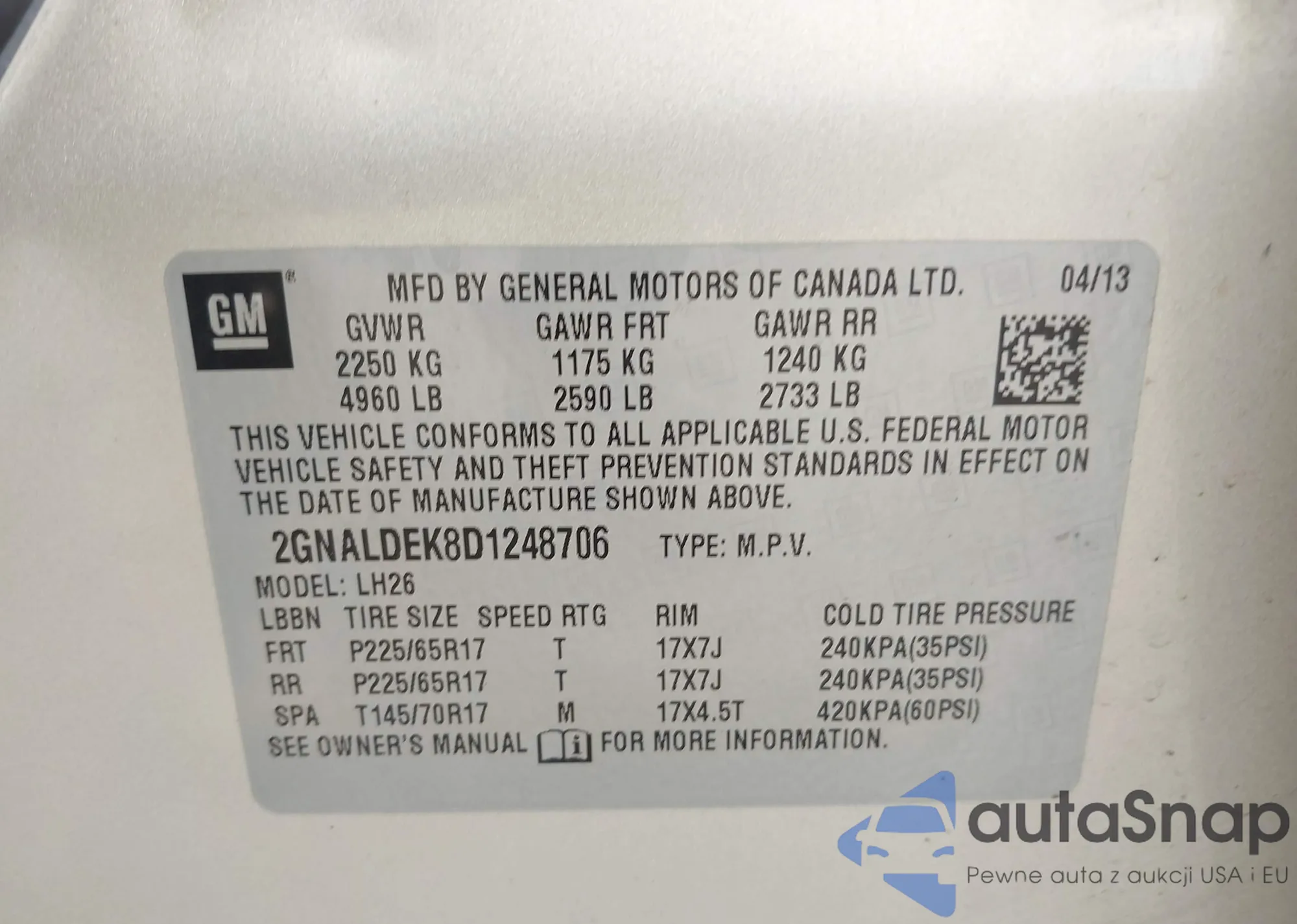 LOT: 43731979 VIN: 2GNALDEK8D1248706