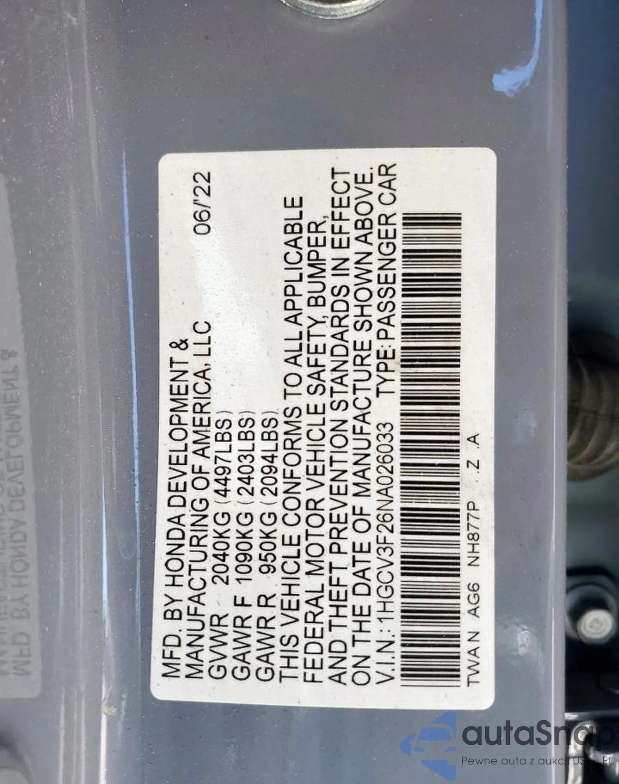 LOT: 86081525 VIN: 1HGCV3F26NA026033