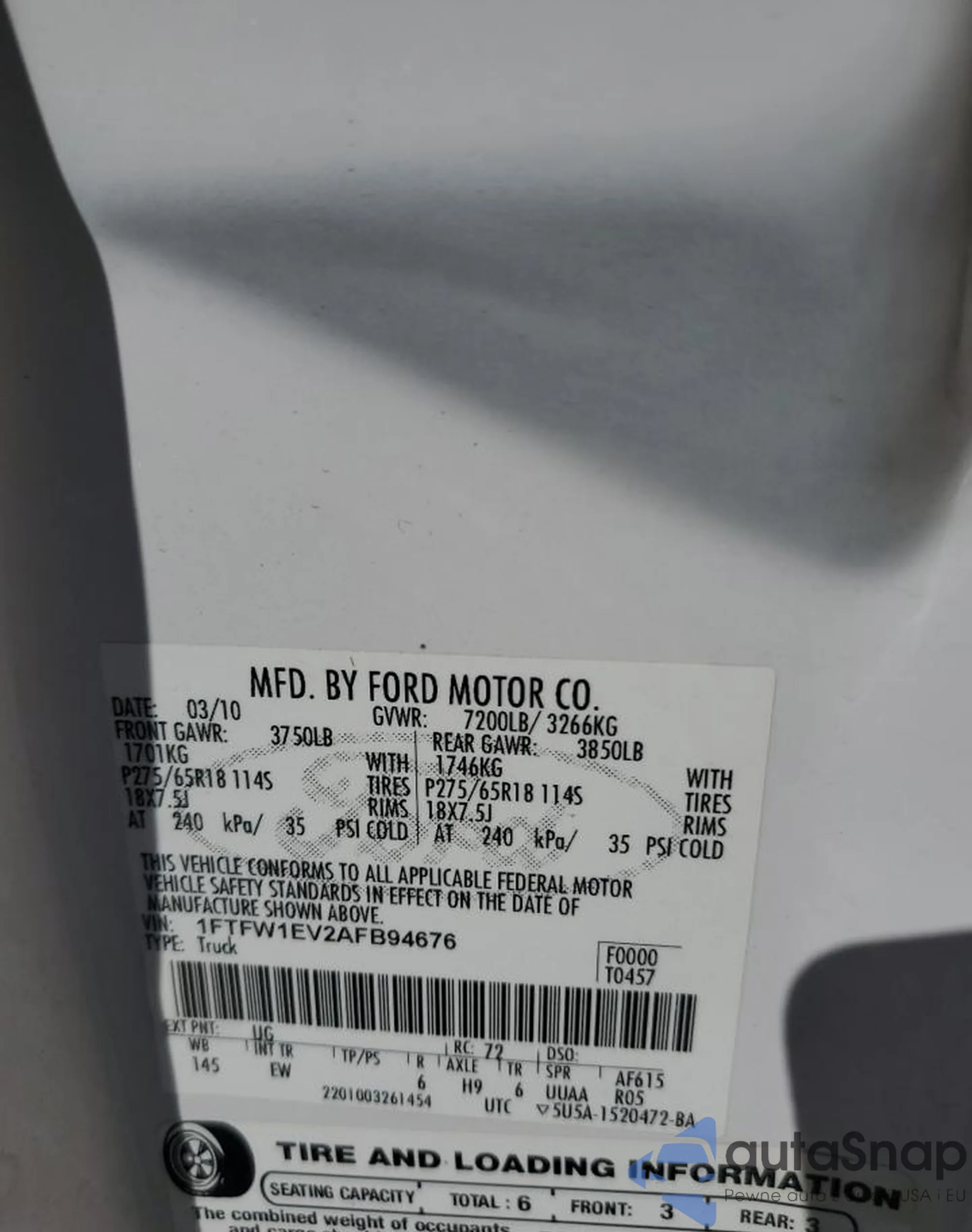 LOT: 85940885 VIN: 1FTFW1EV2AFB94676