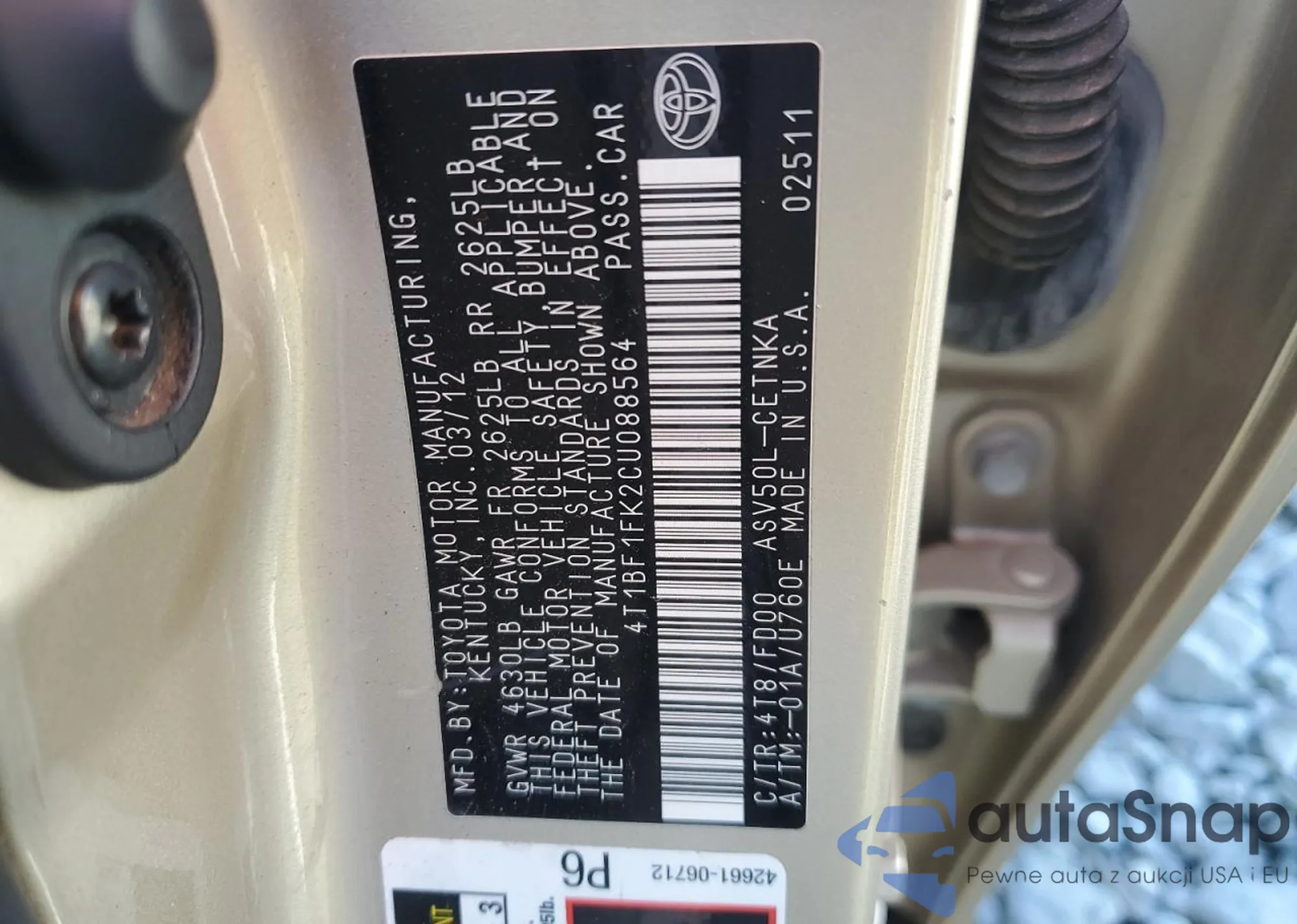 • VIN 4T1BF1FK2CU088564