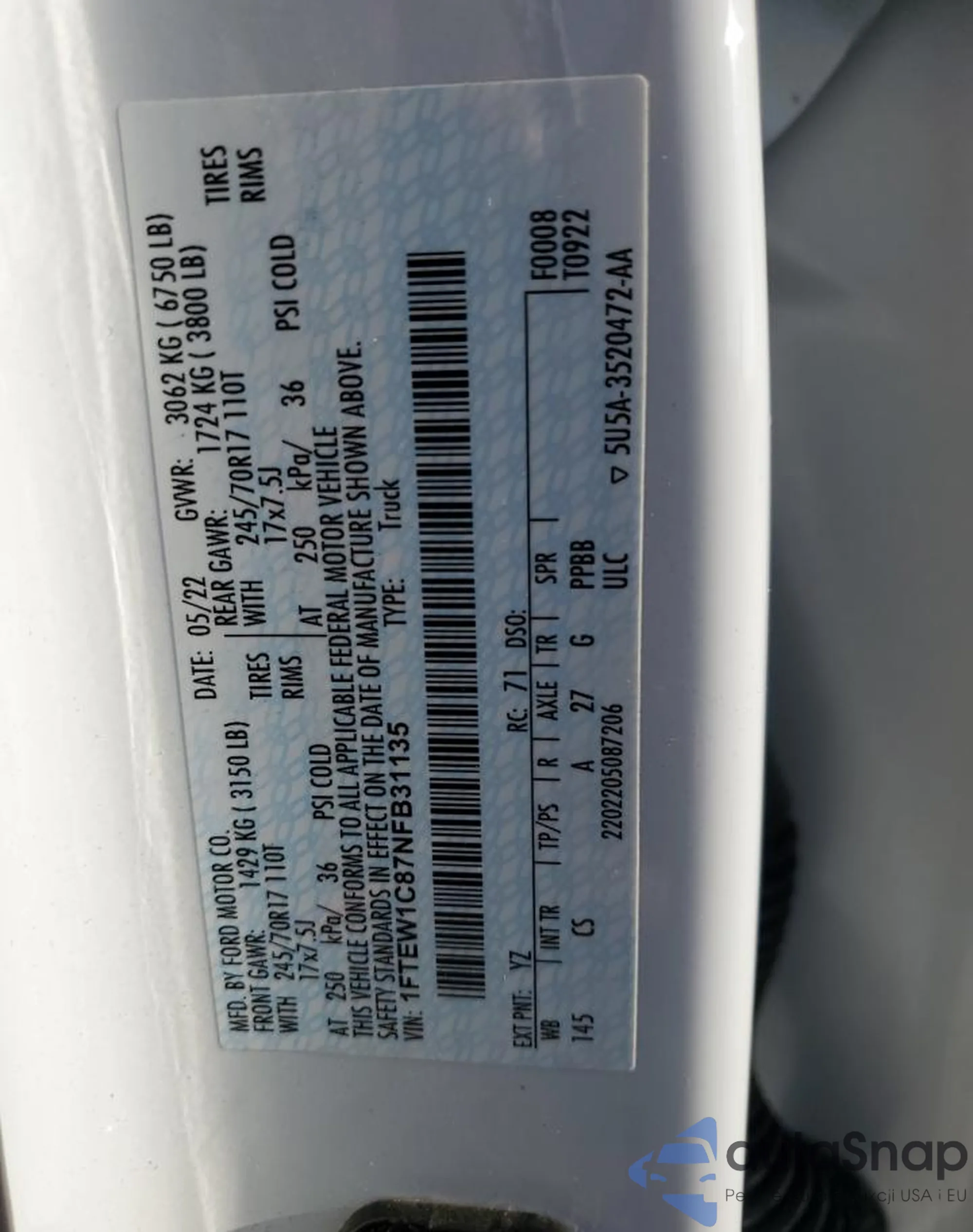 • VIN 3FTTW8E38NRA95816