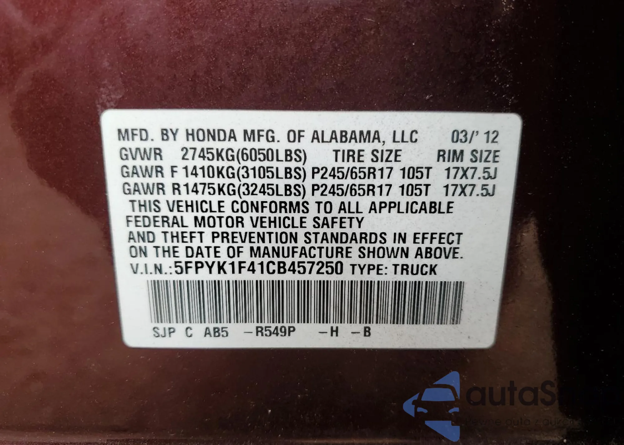 • VIN 5FPYK1F41CB457250