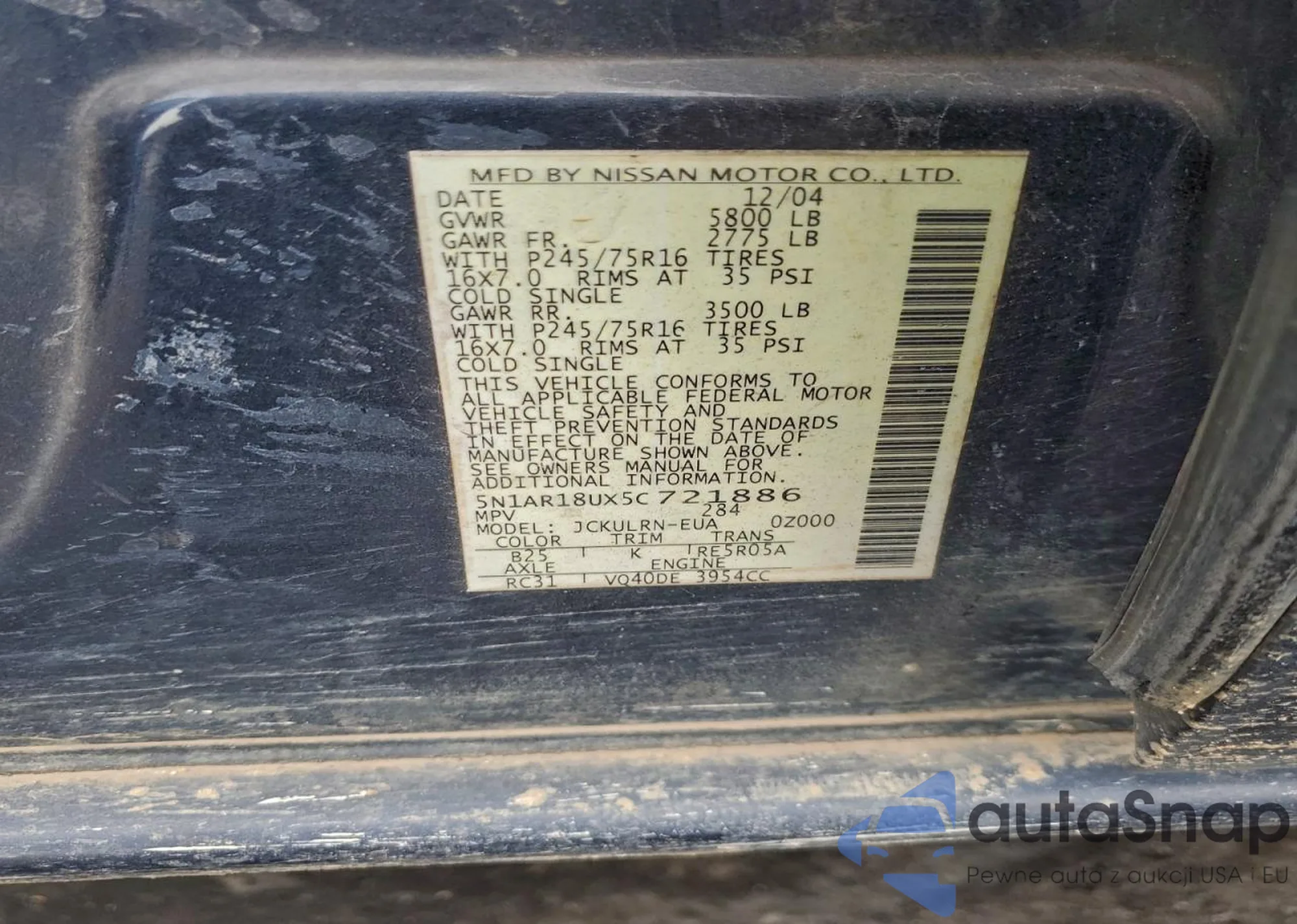 • VIN 5N1AR18UX5C721886