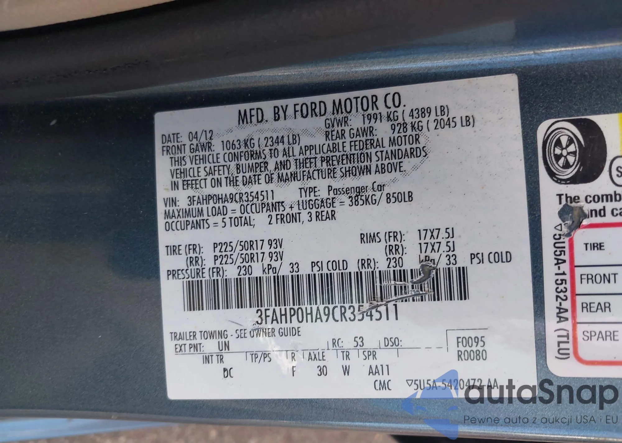 • VIN 3FAHP0HA9CR354511