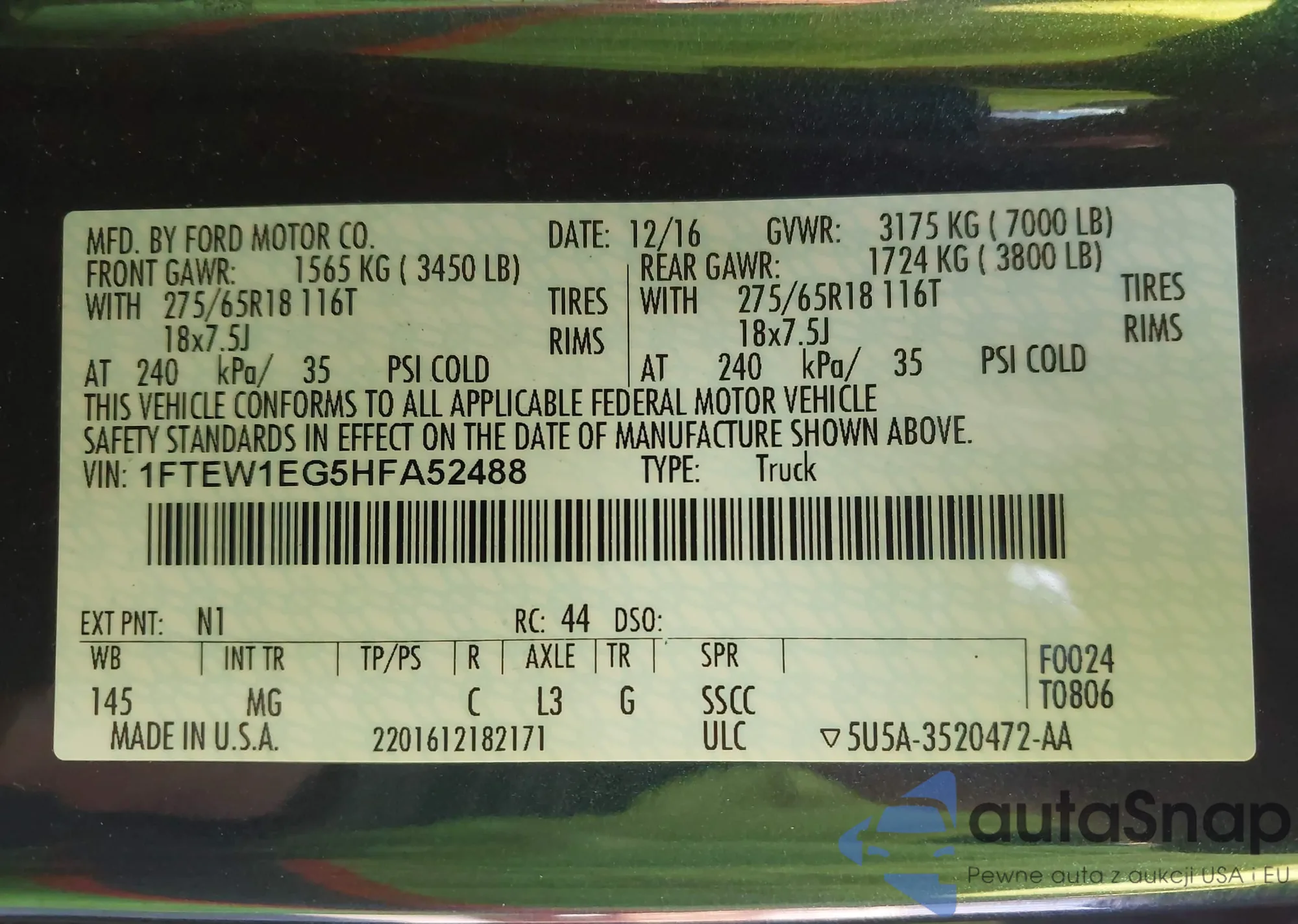 LOT: 43689885 VIN: 1FTEW1EG5HFA52488