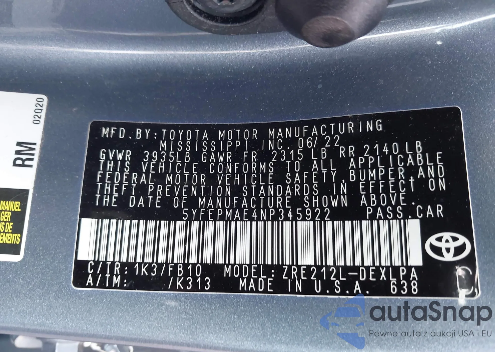 • VIN 5YFEPMAE4NP345922