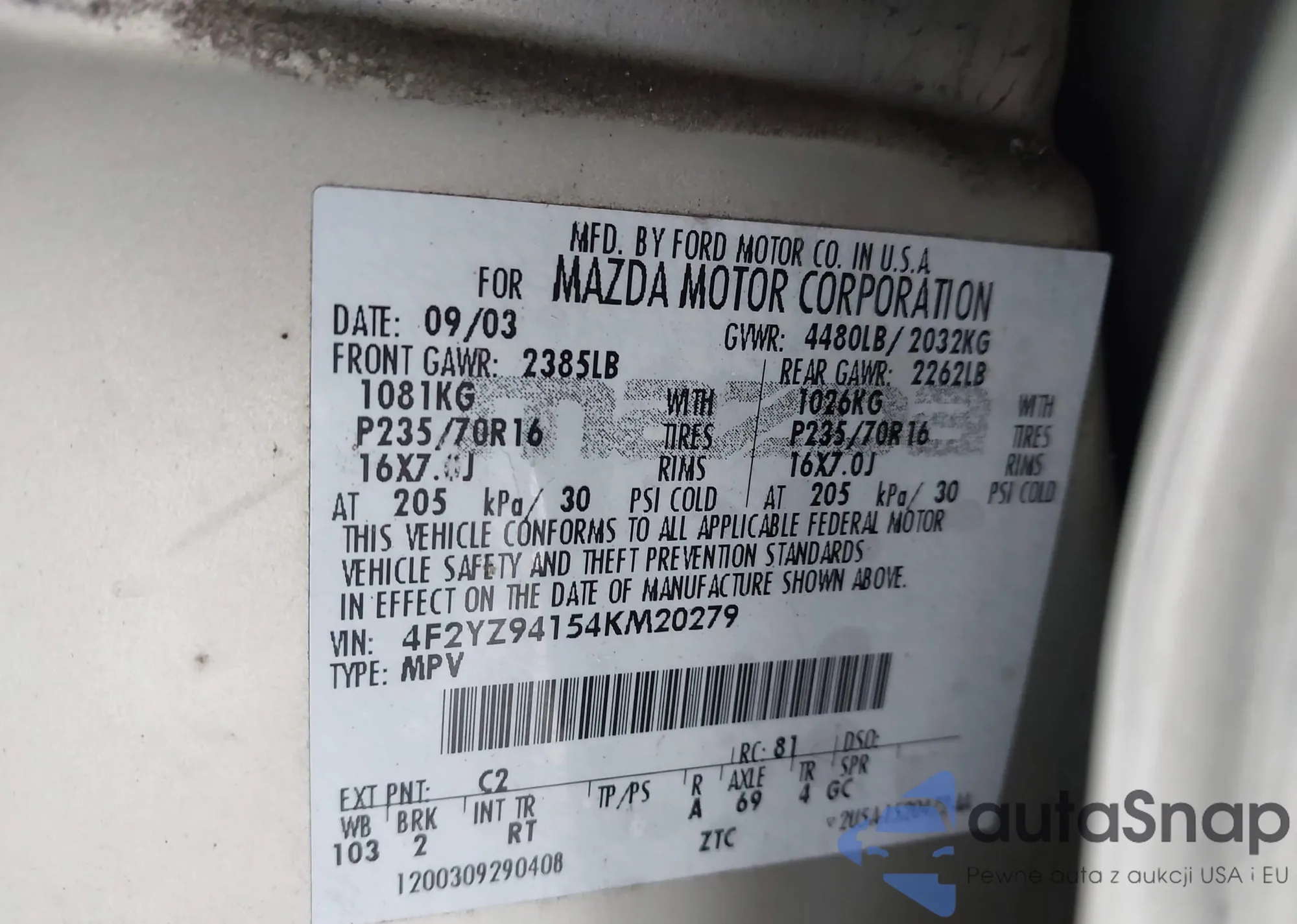 LOT: 43826427 VIN: 4F2YZ94154KM20279