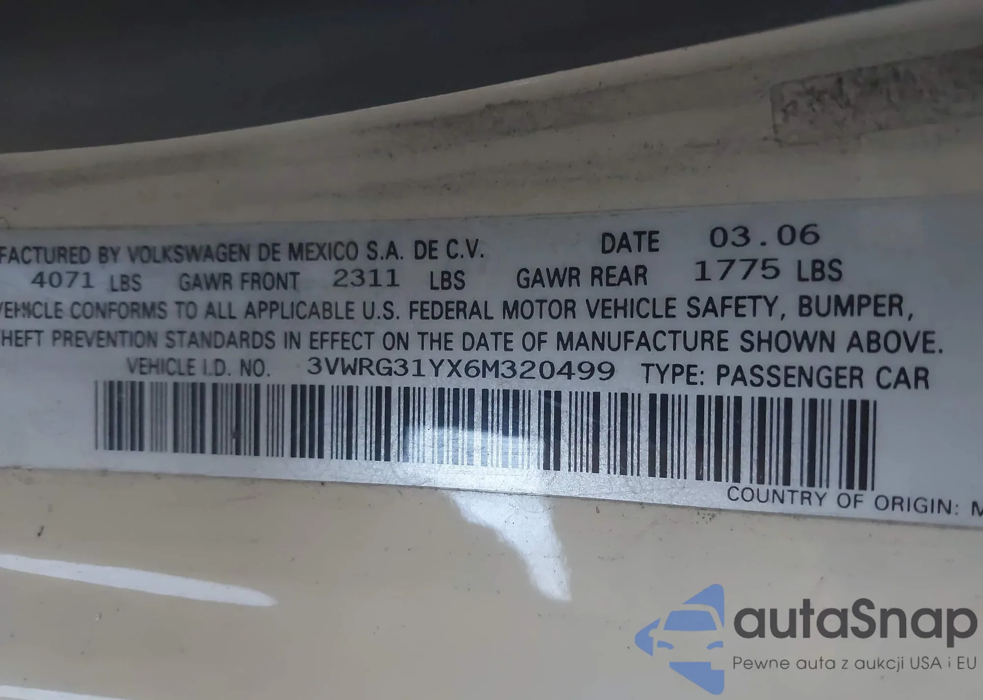 • VIN 3VWRG31YX6M320499