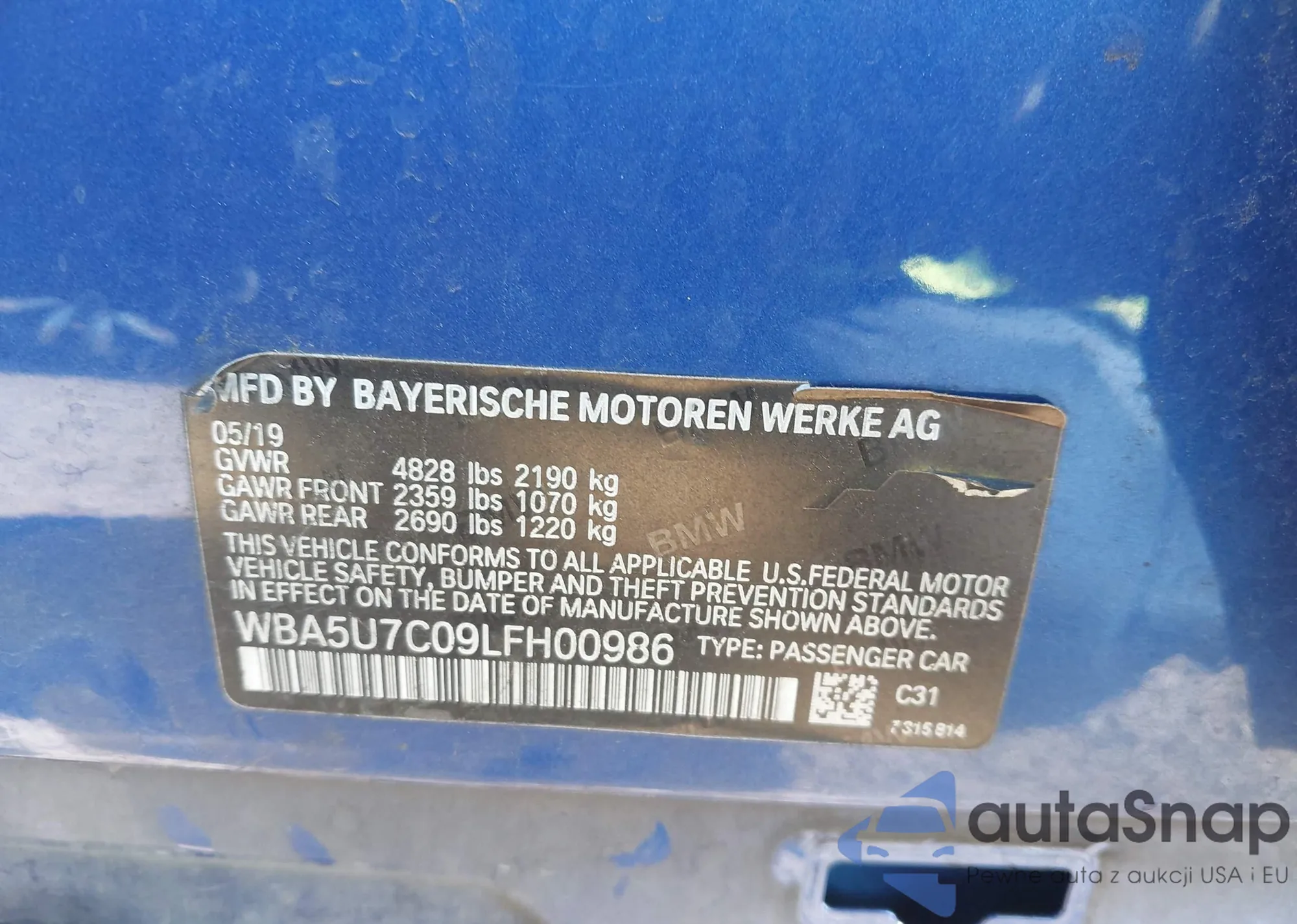 LOT: 43546569 VIN: WBA5U7C09LFH00986