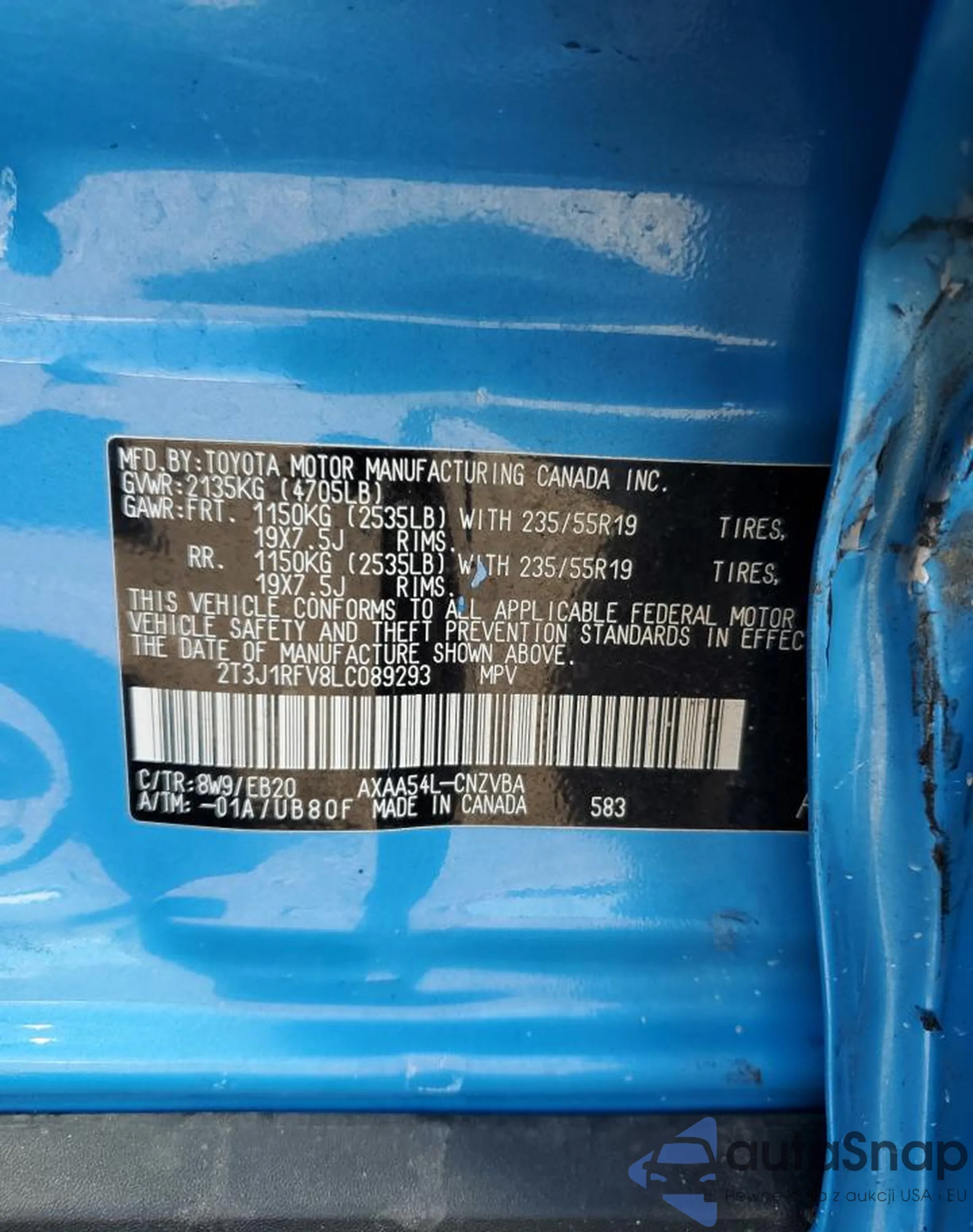 LOT: 80391905 VIN: 2T3J1RFV8LC089293