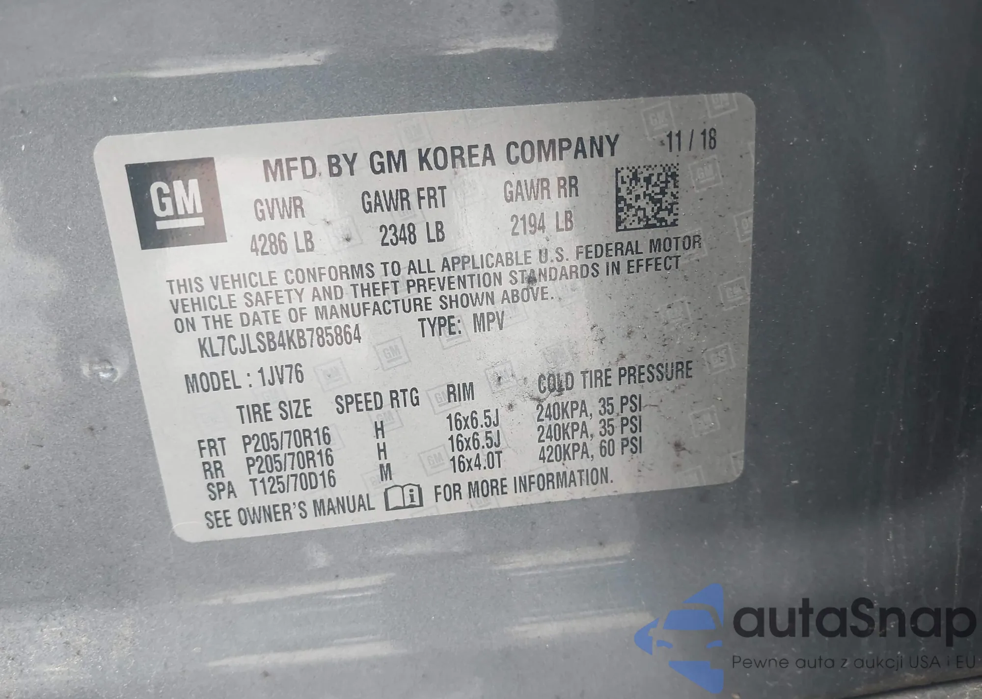 LOT: 43304937 VIN: KL7CJLSB4KB785864
