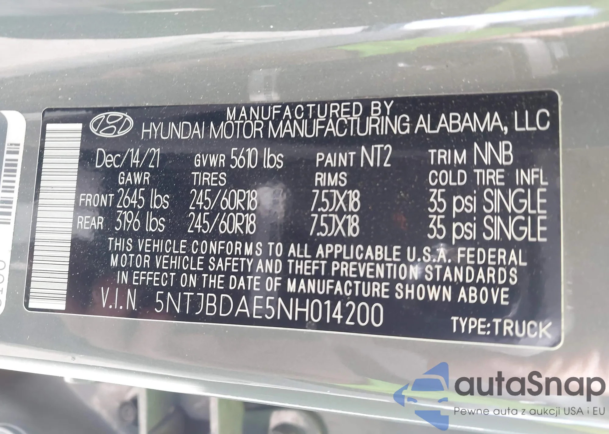 • VIN 5NTJBDAE5NH014200