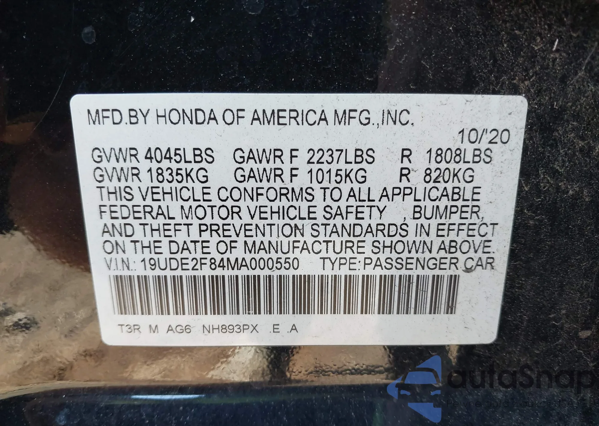• VIN 19UDE2F84MA000550