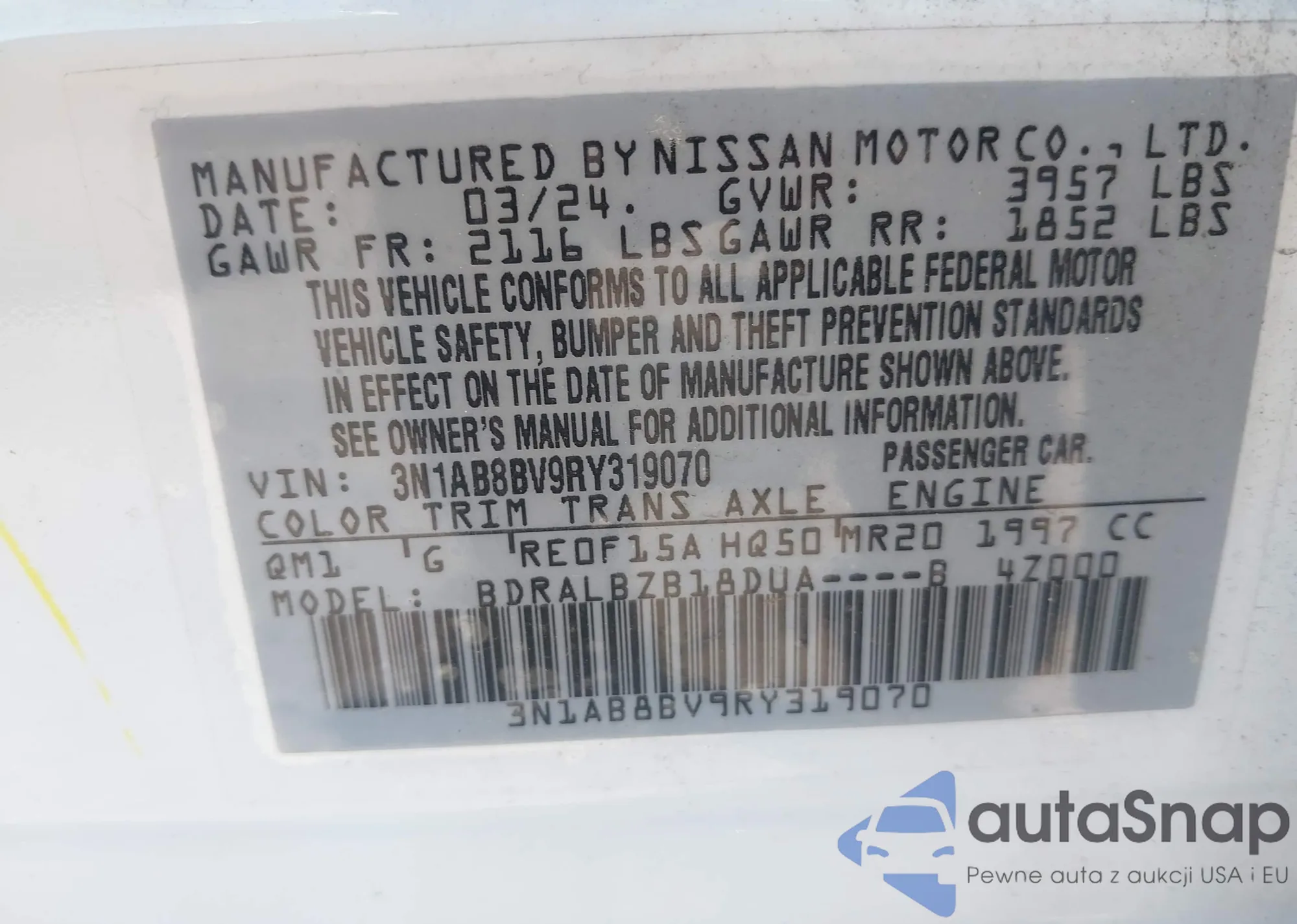 • VIN 3N1AB8BV9RY319070
