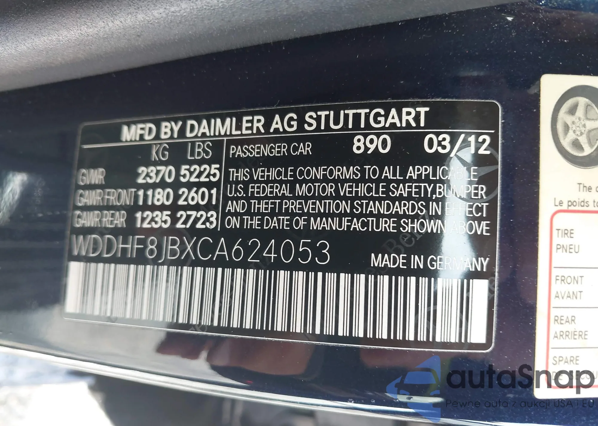 LOT: 43011812 VIN: WDDHF8JBXCA624053