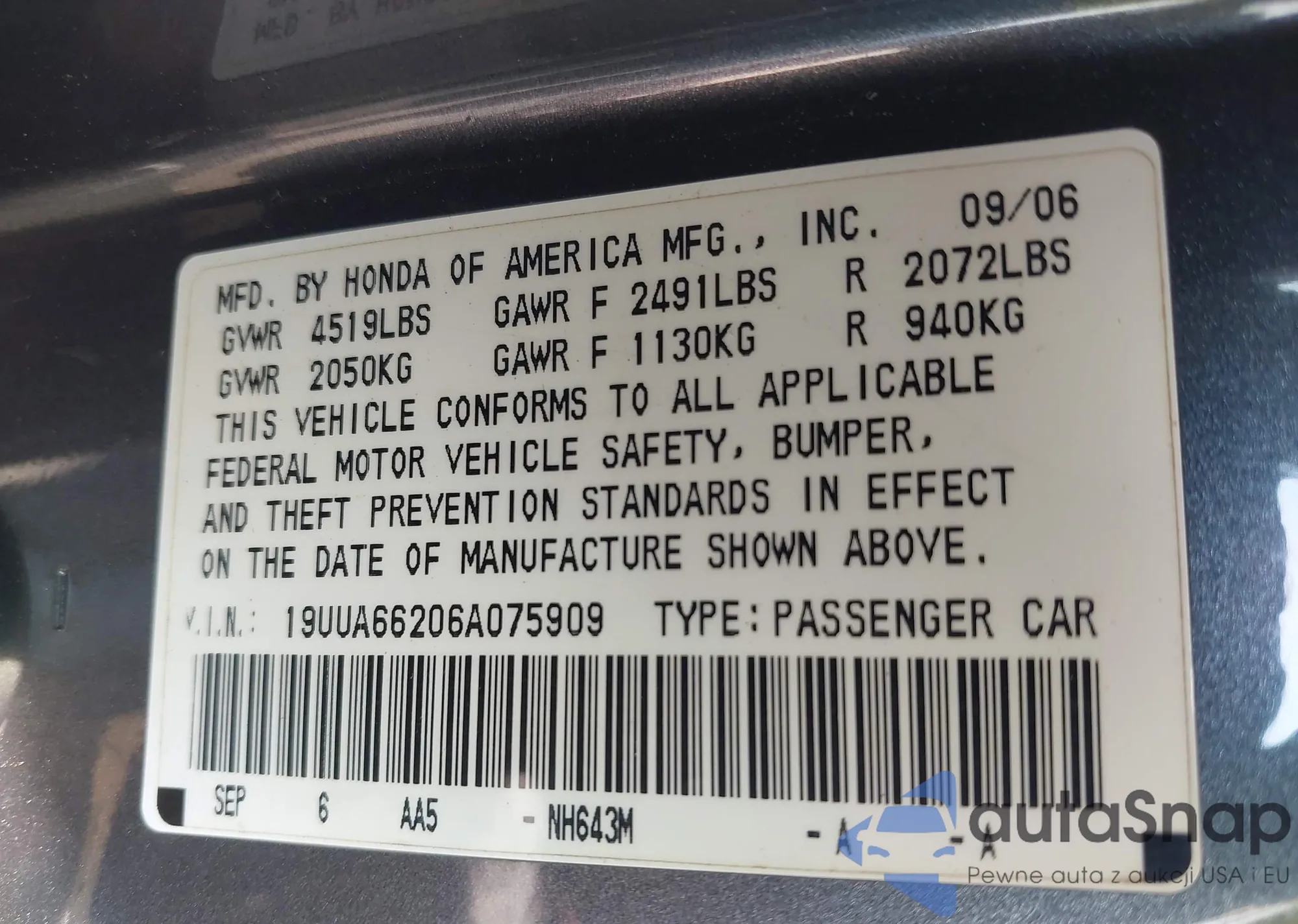 • VIN 19UUA66206A075909