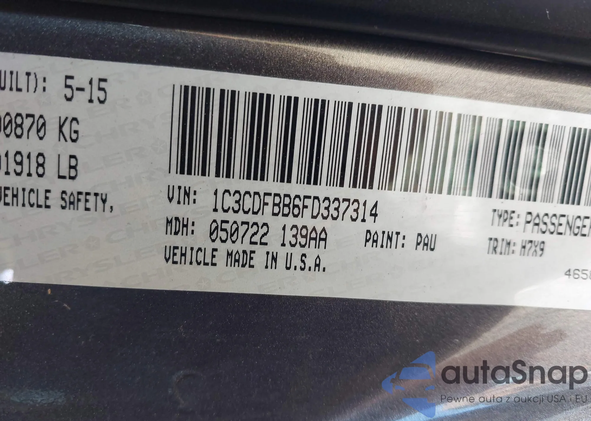 • VIN 1C3CDFBB6FD337314