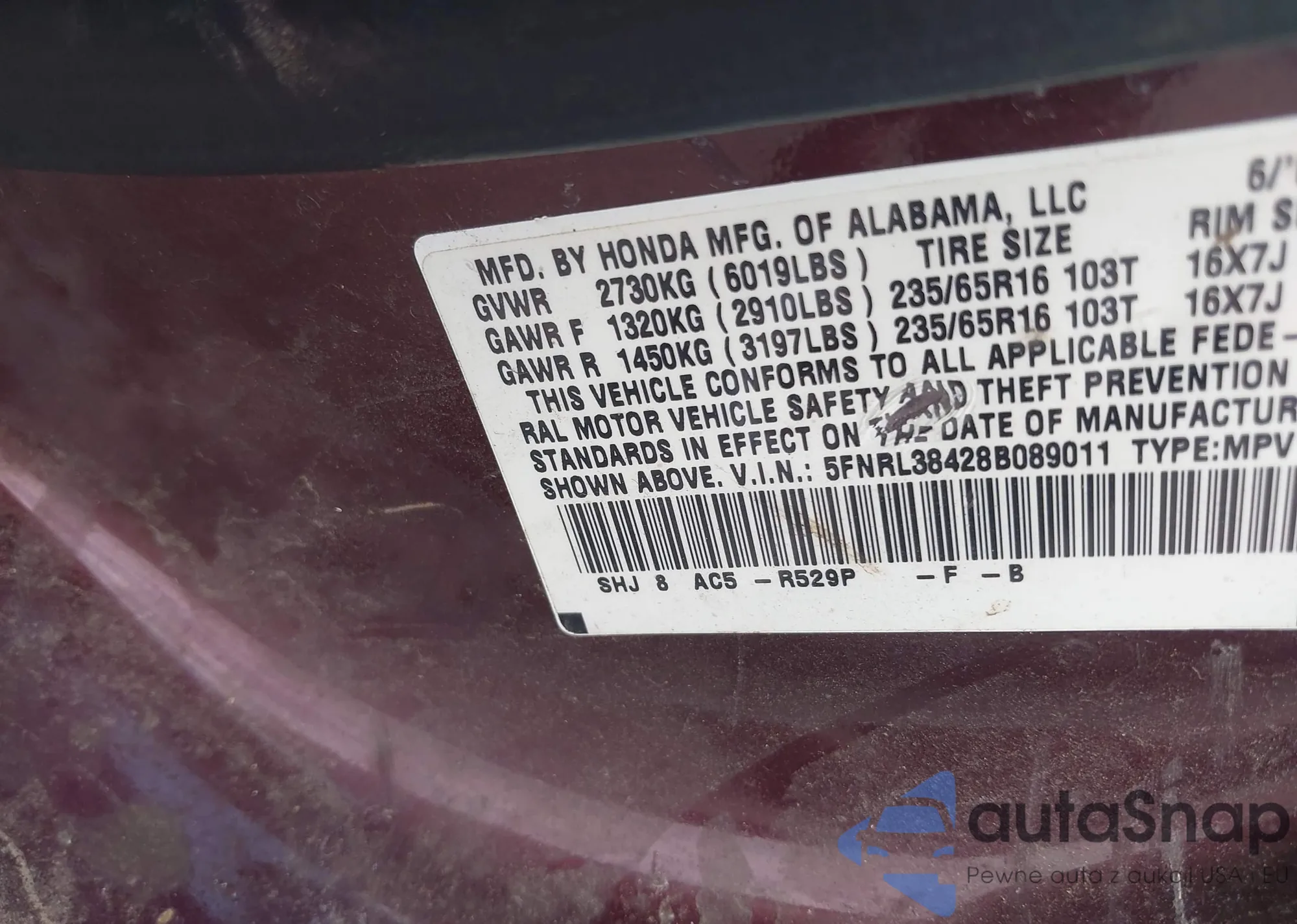 LOT: 42665951 VIN: 5FNRL38428B089011