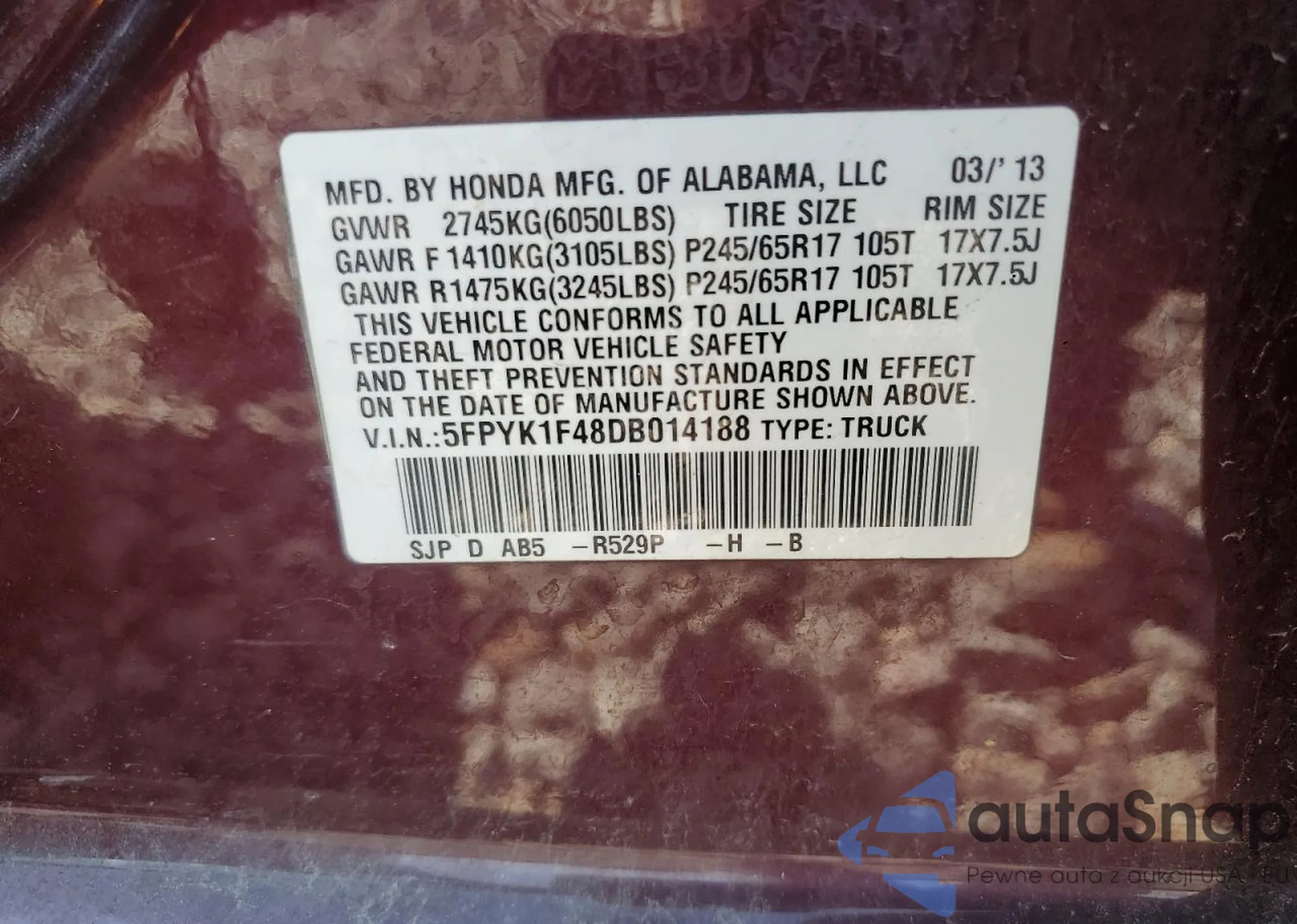 • VIN 5FPYK1F48DB014188