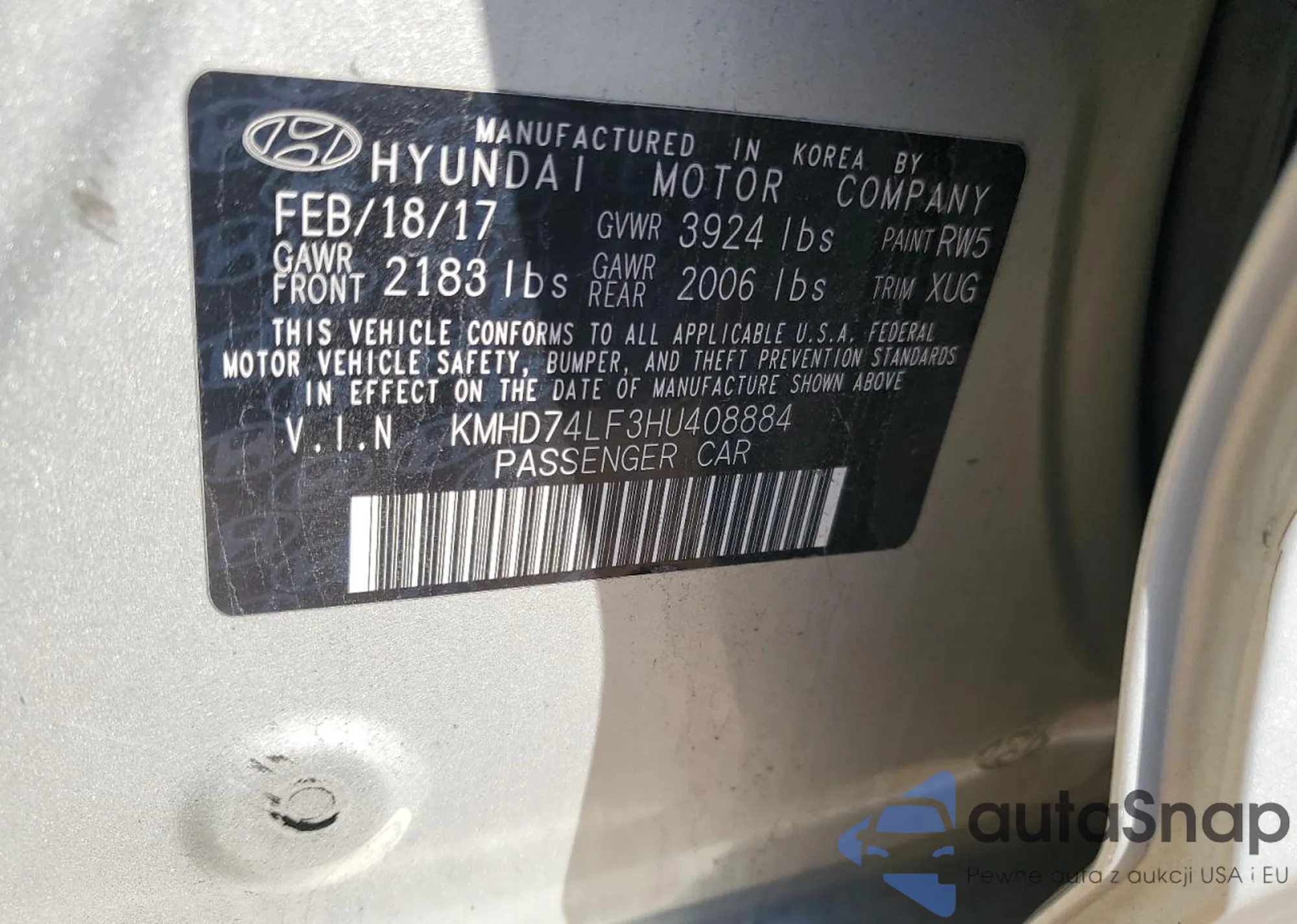 LOT: 85344665 VIN: KMHD74LF3HU408884