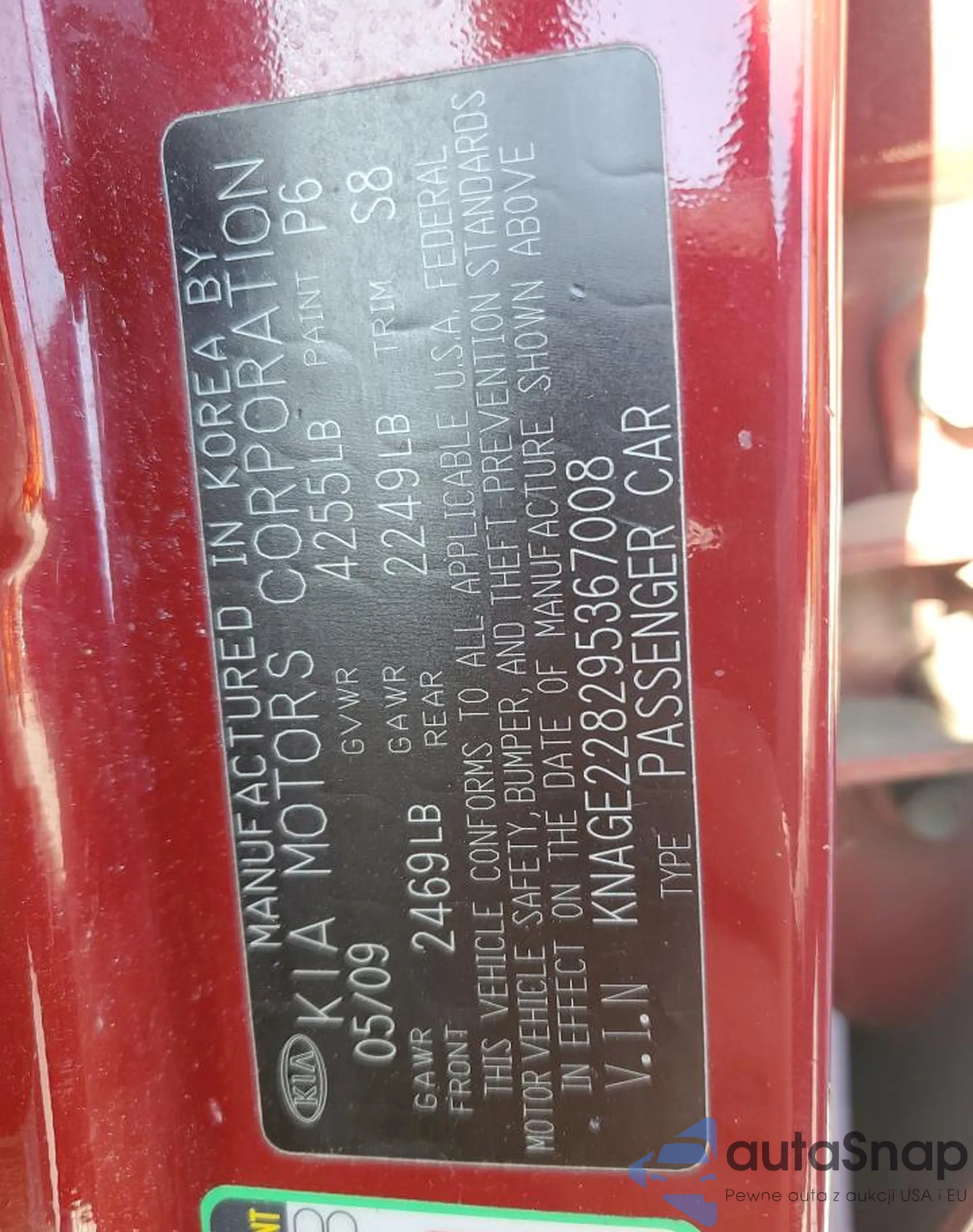 2009 Kia Optima Lx z USA, uszkodzony, nr VIN KNAGE228295367008