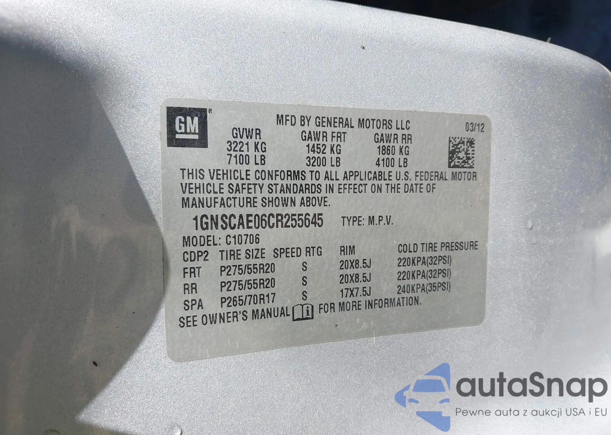 LOT: 43309061 VIN: 1GNSCAE06CR255645