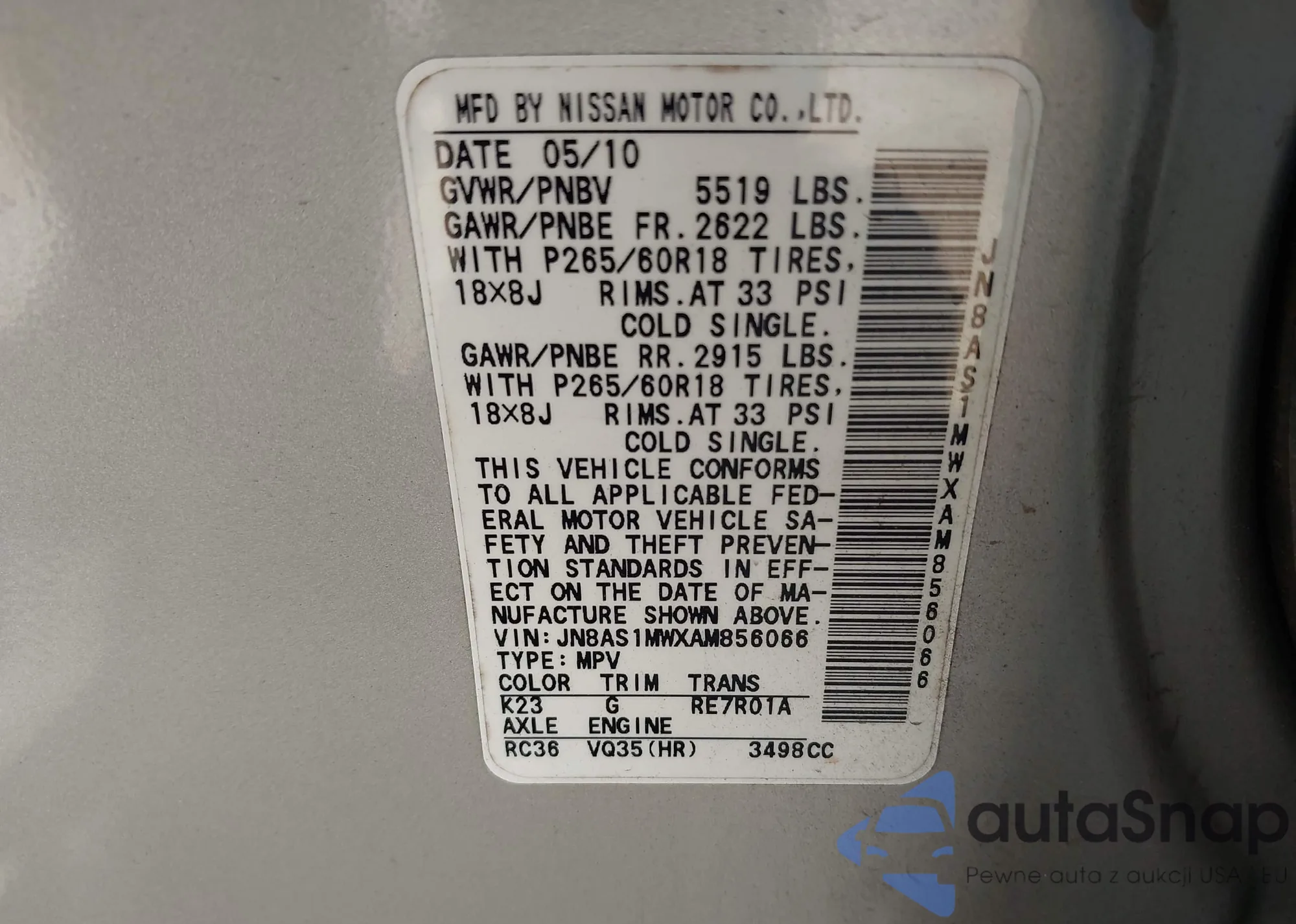 LOT: 43250025 VIN: JN8AS1MWXAM856066