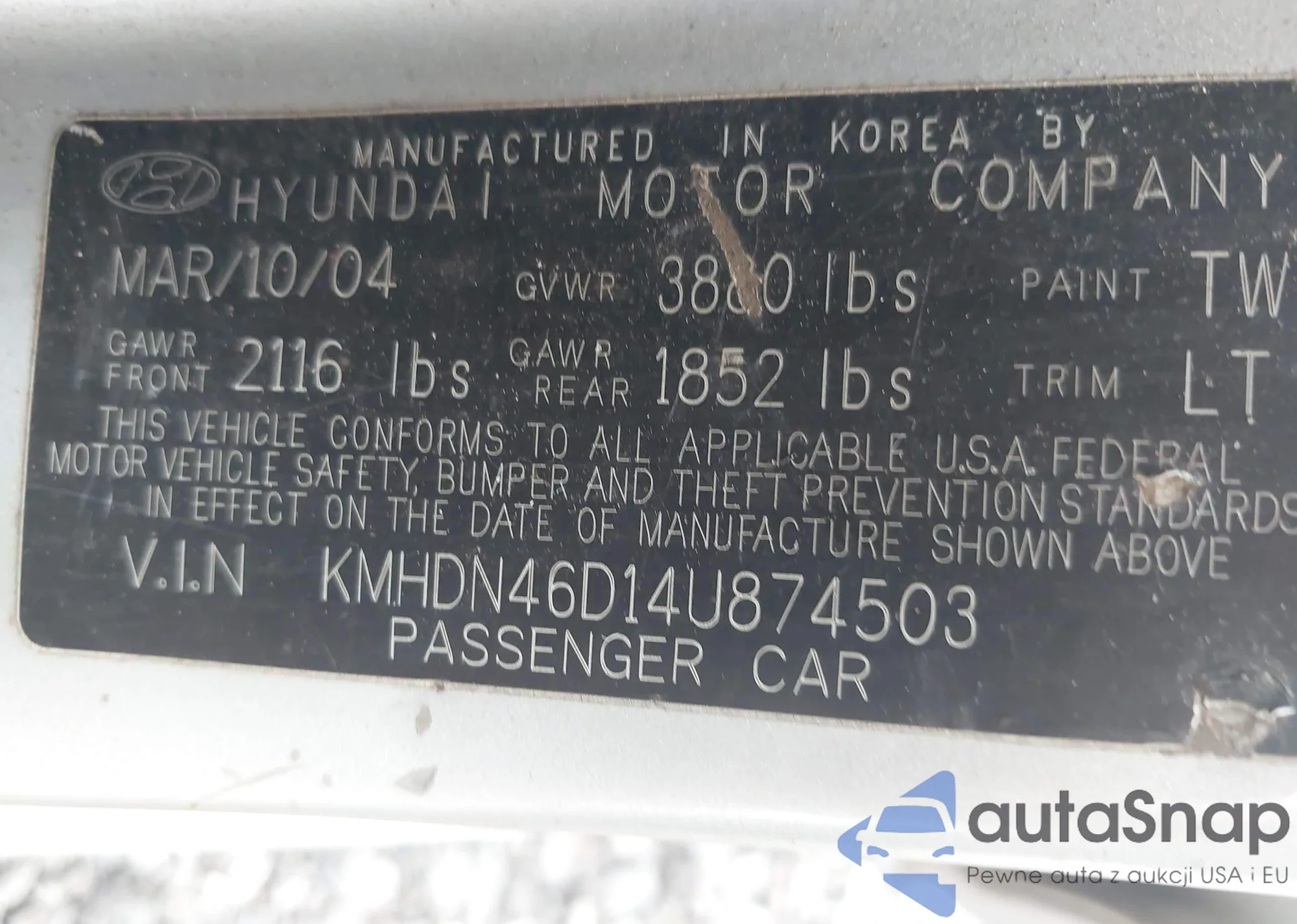 LOT: 43261077 VIN: KMHDN46D14U874503