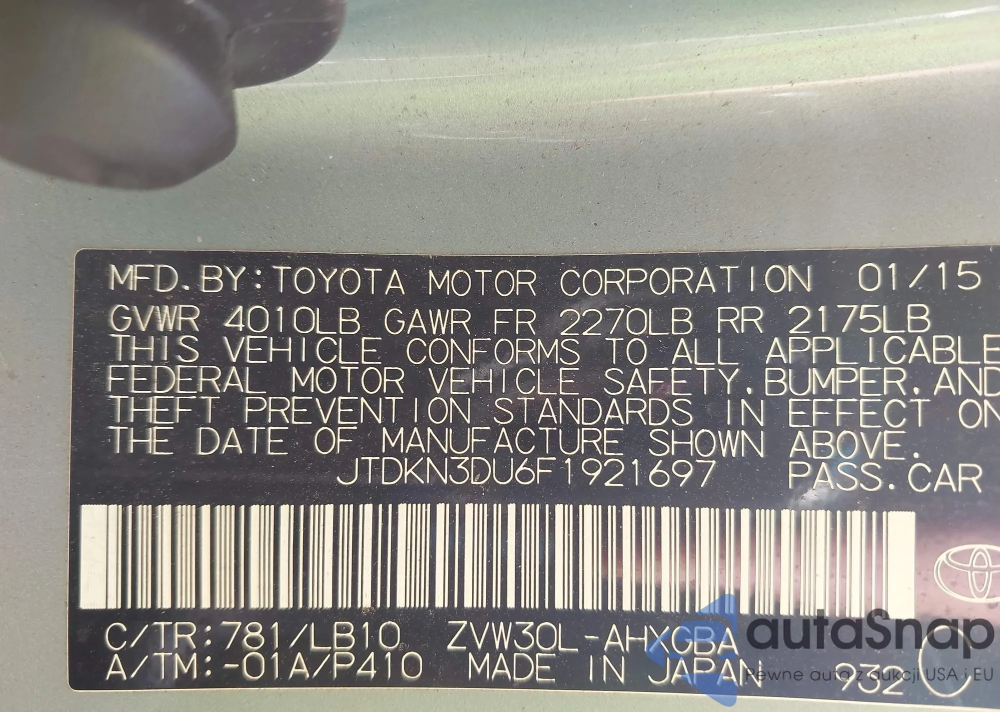 LOT: 43601554 VIN: JTDKN3DU6F1921697