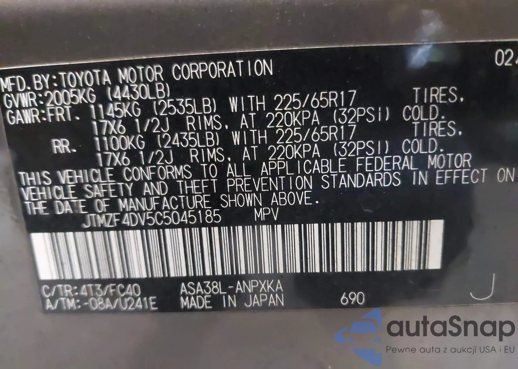 LOT: 43908711 VIN: 5TDBT48A65S251730