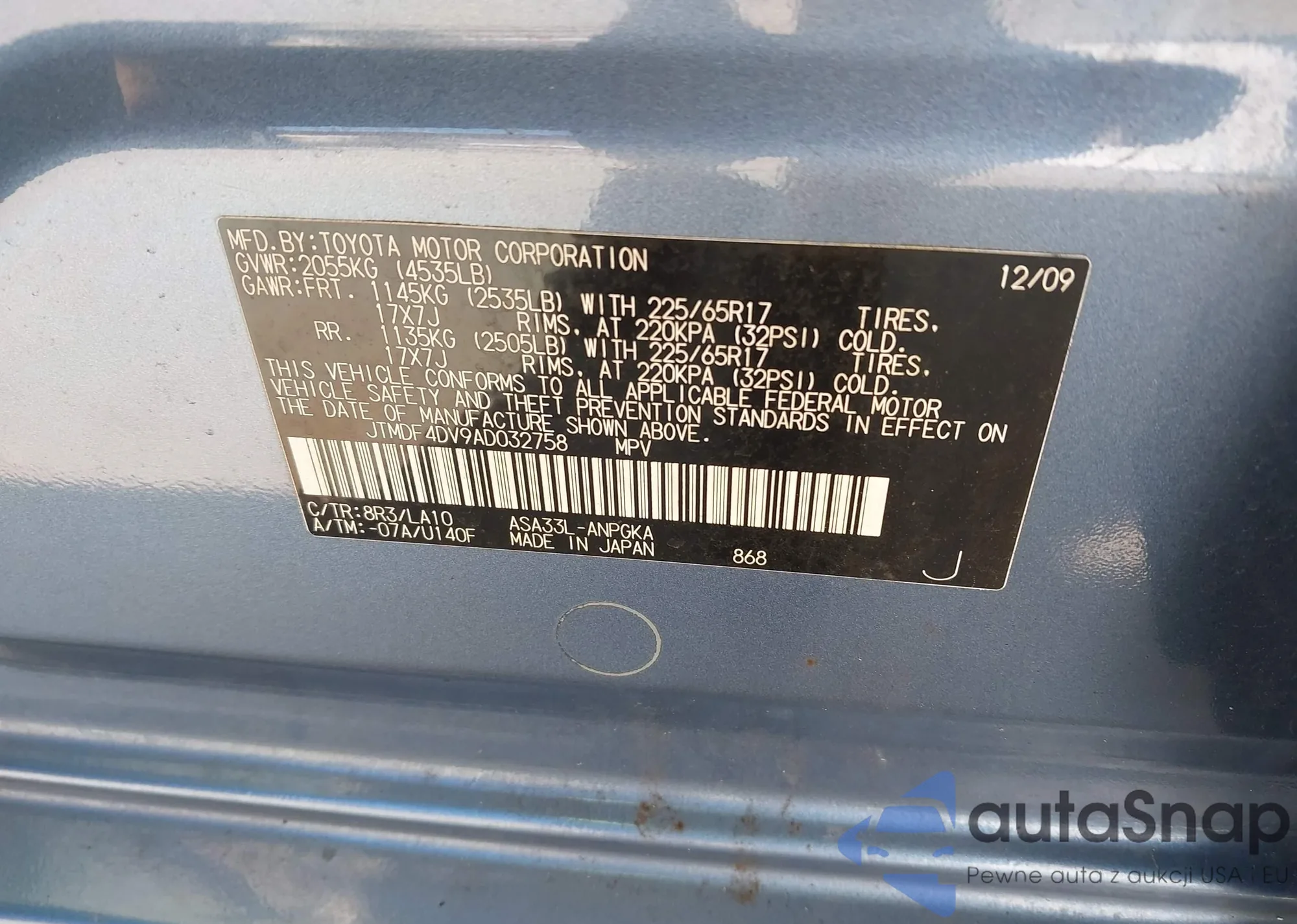 LOT: 43690240 VIN: JT3HN87R210325200