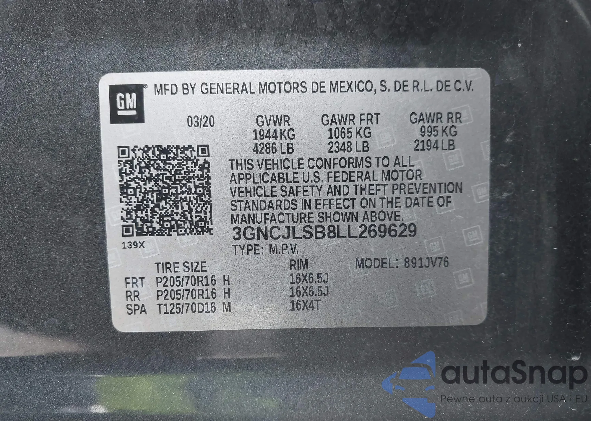 • VIN 3GNCJLSB8LL269629