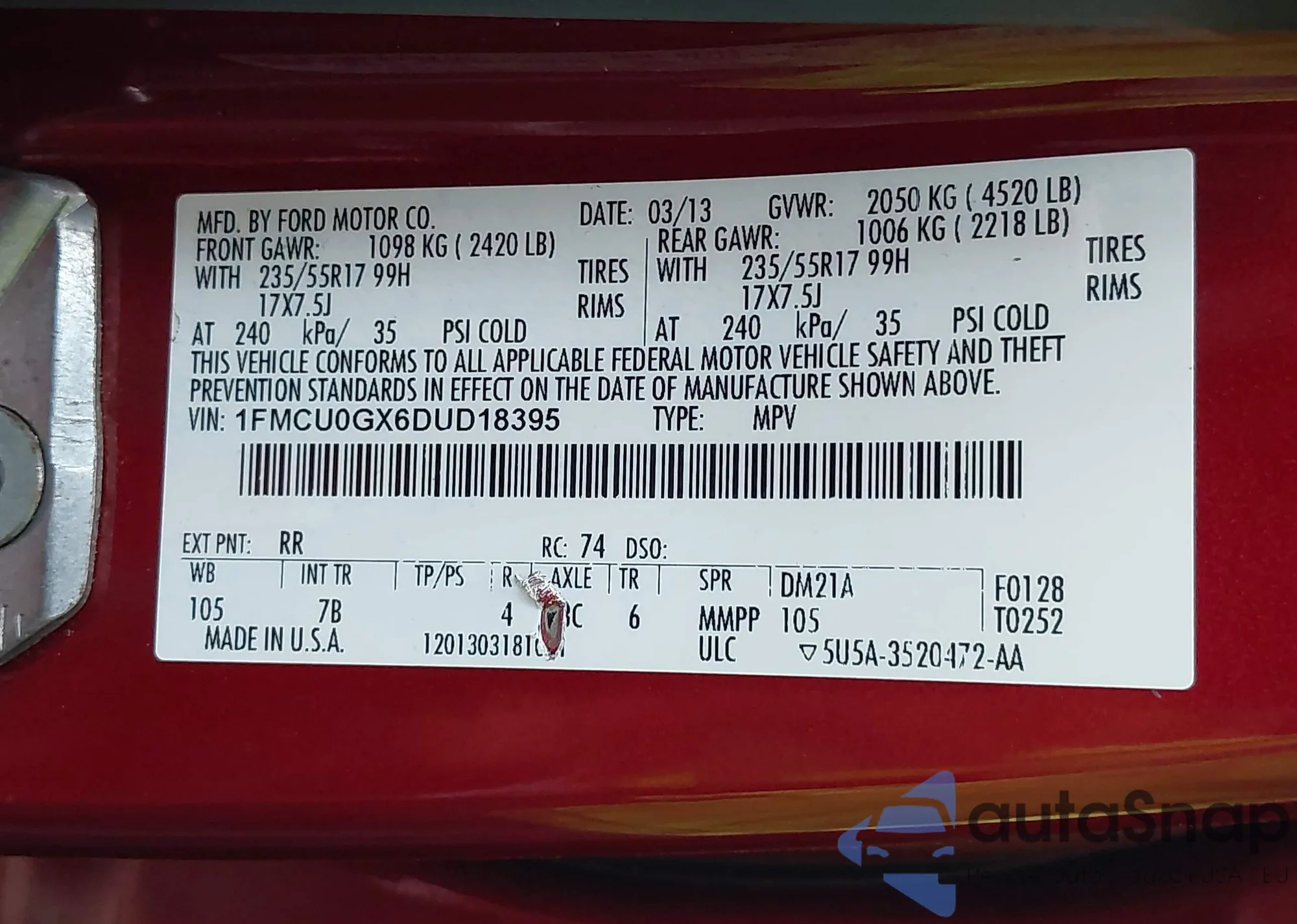 • VIN 1FMCU0GX6DUD18395