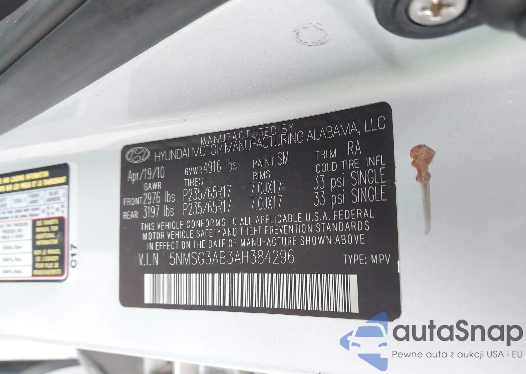 LOT: 43223357 VIN: 5NMSG3AB3AH384296