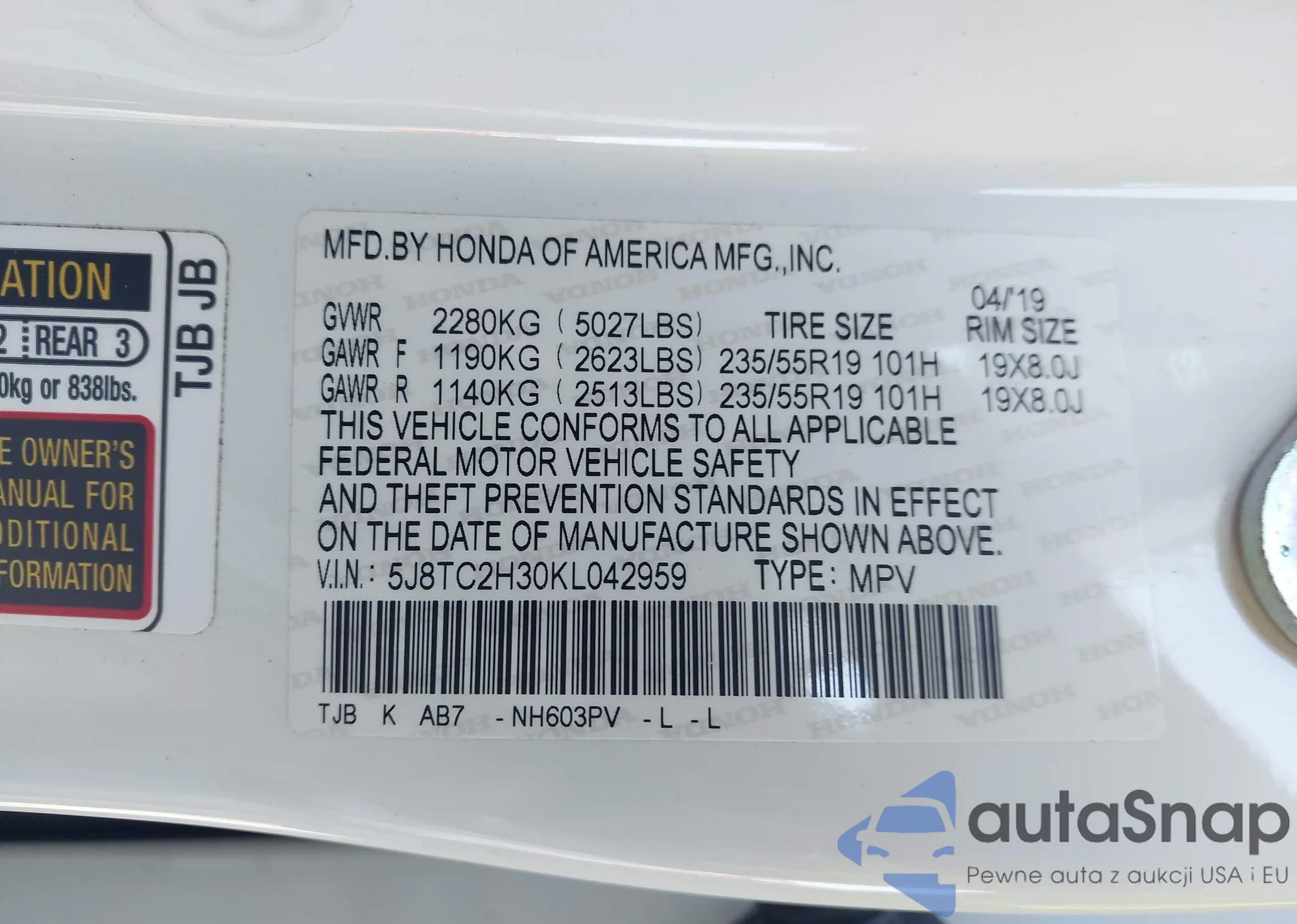 • VIN 5J8TC2H30KL042959