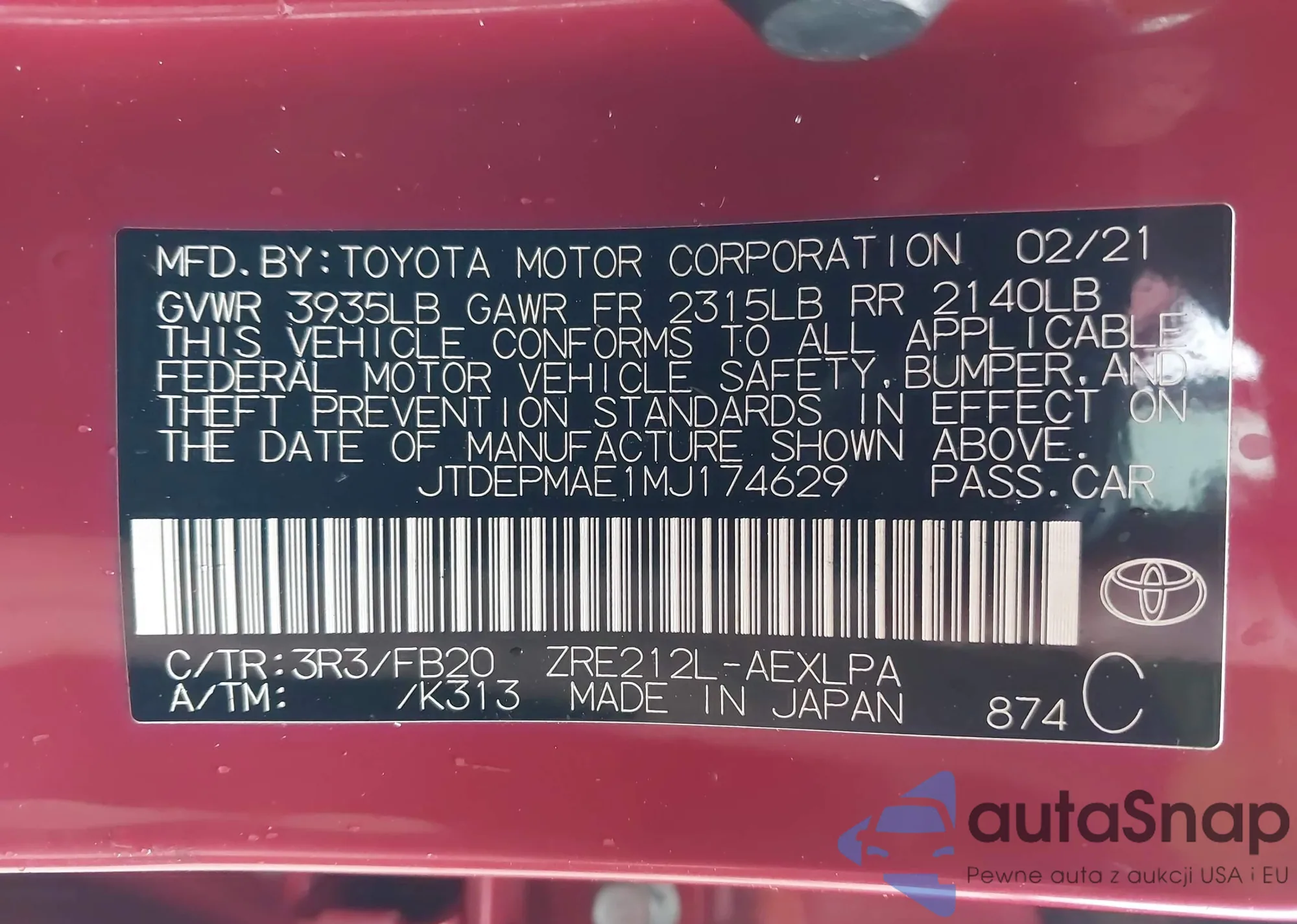 LOT: 43392628 VIN: JTDEPMAE1MJ174629