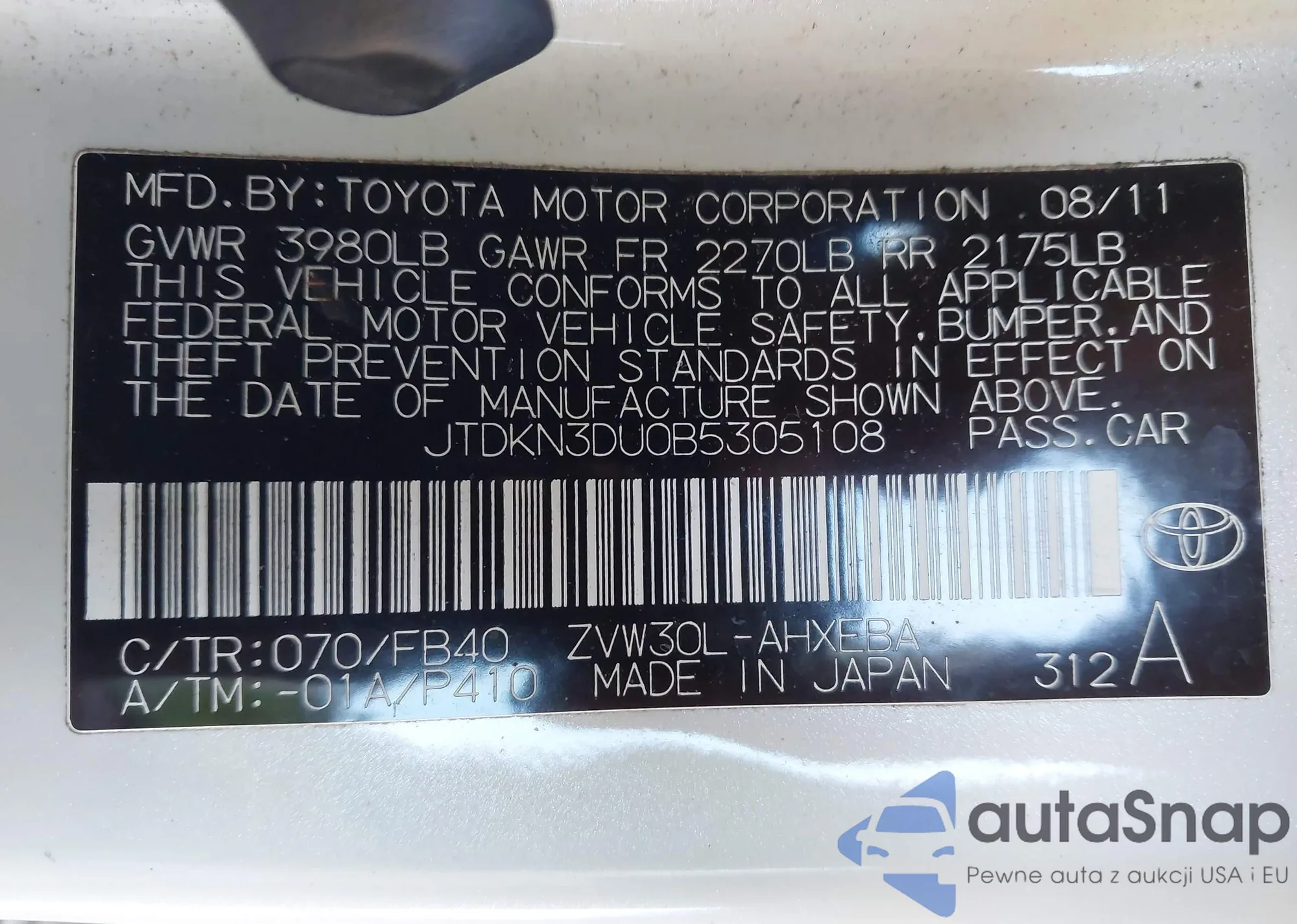 LOT: 43754962 VIN: JTDKN3DU0B5305108
