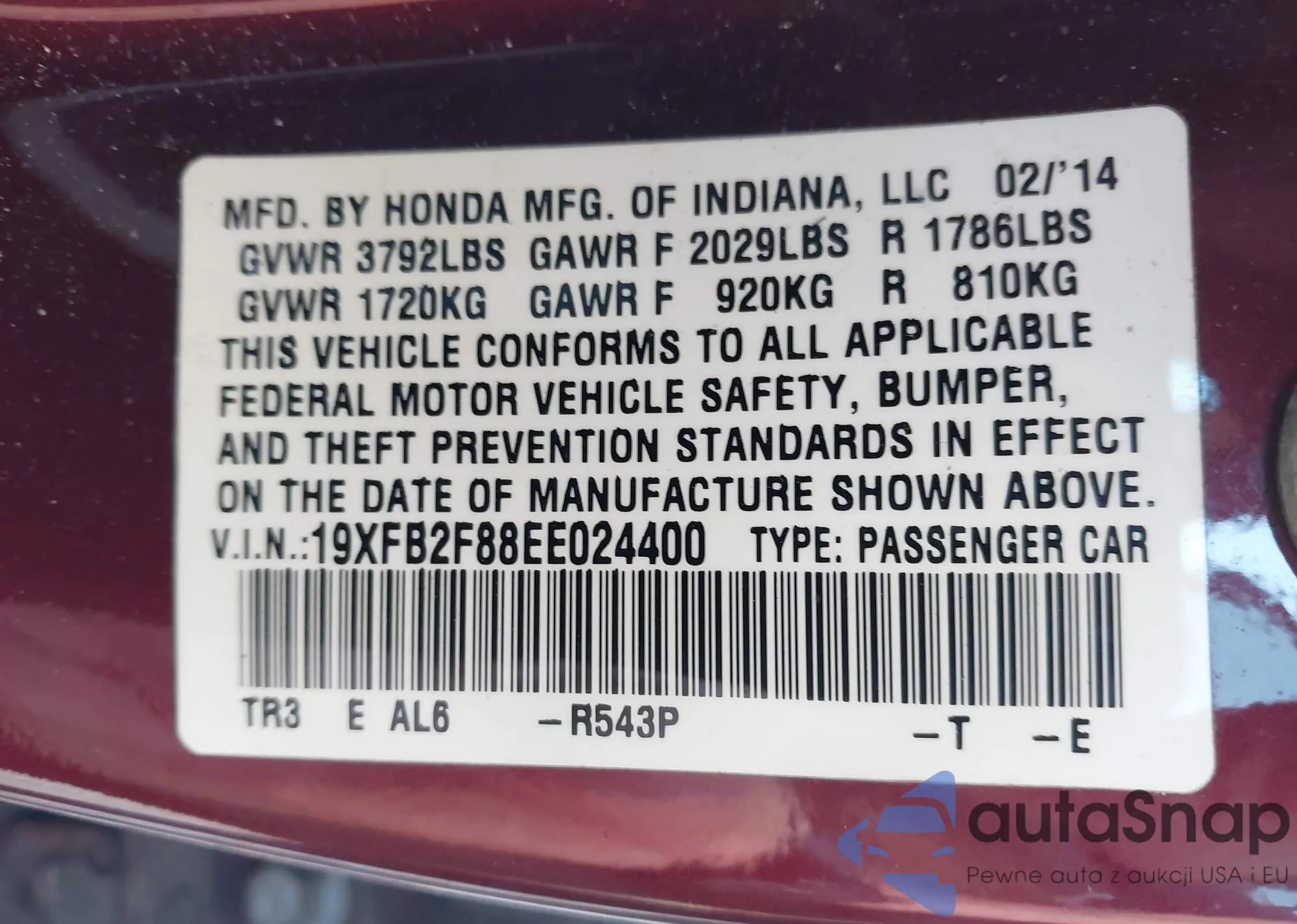 LOT: 43732787 VIN: 1VWBT7A30HC011234